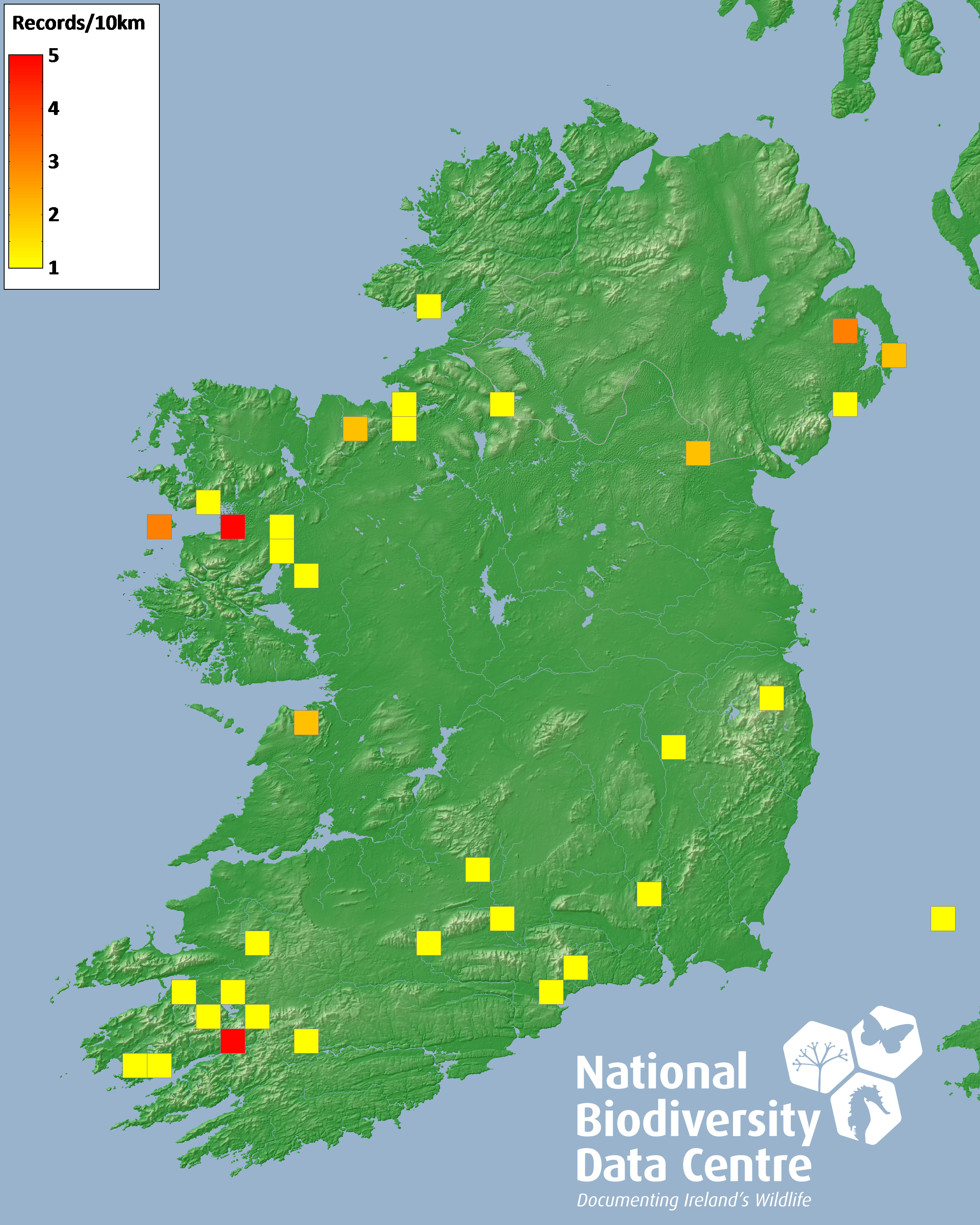 Distribution of the number of records recorded within each 10km grid square (ITM).Marine Map - 50km