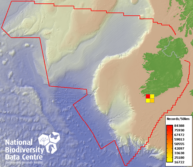 Distribution of the number of records within each 10km grid square (ITM).Marine Map - 50Km