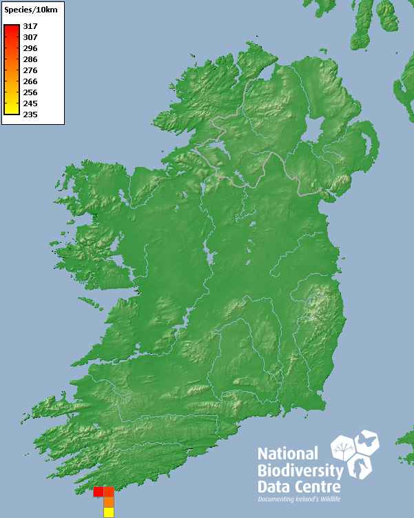 Distribution of the number of species recorded within each 10km grid square (ITM).Marine Map - 50Km