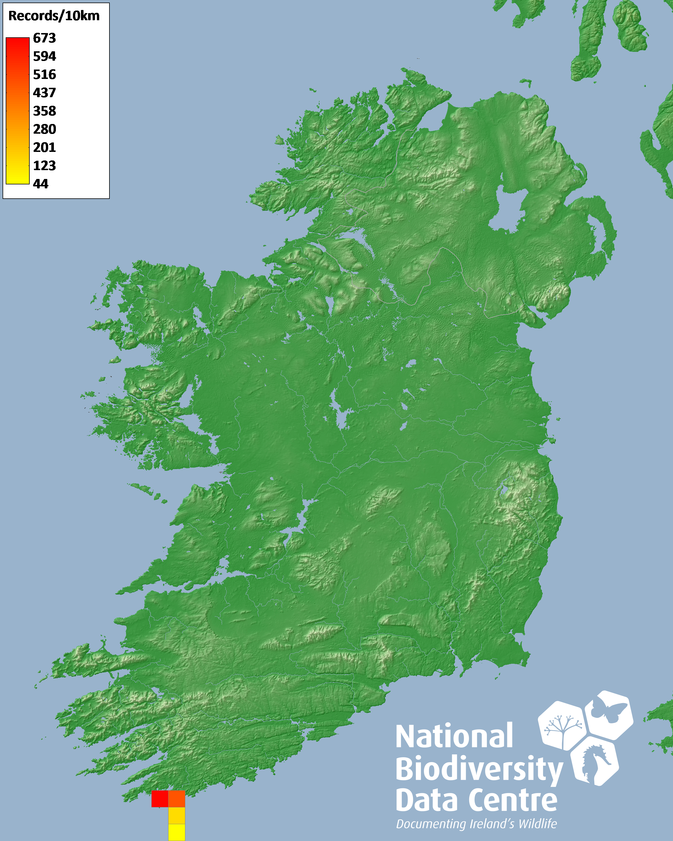 Distribution of the number of records recorded within each 10km grid square (ITM).Marine Map - 50km