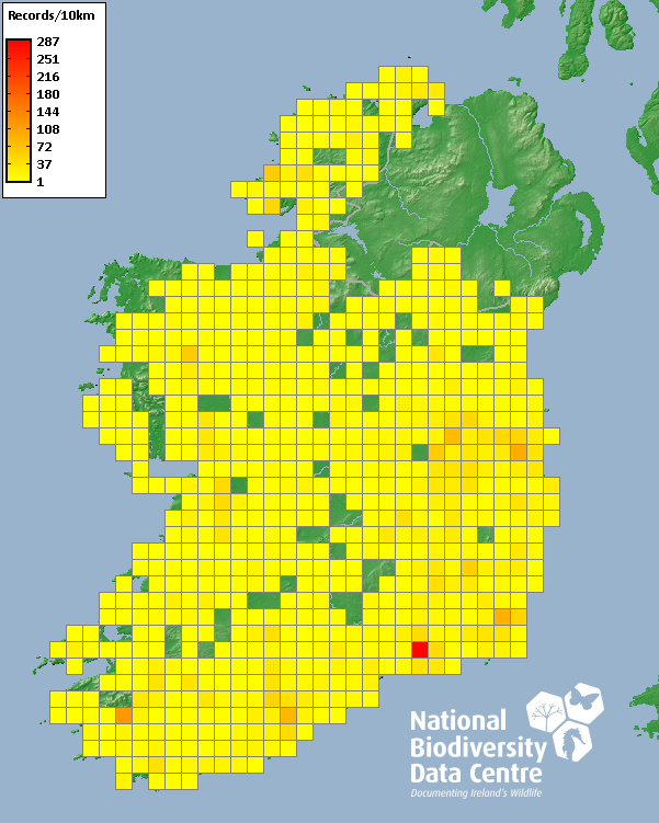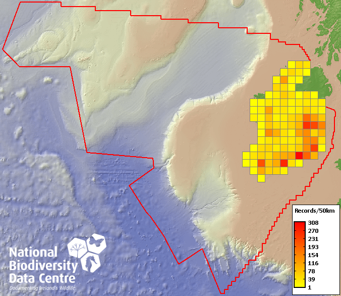 Distribution of the number of records recorded within each 10km grid square (ITM).Marine Map - 50km