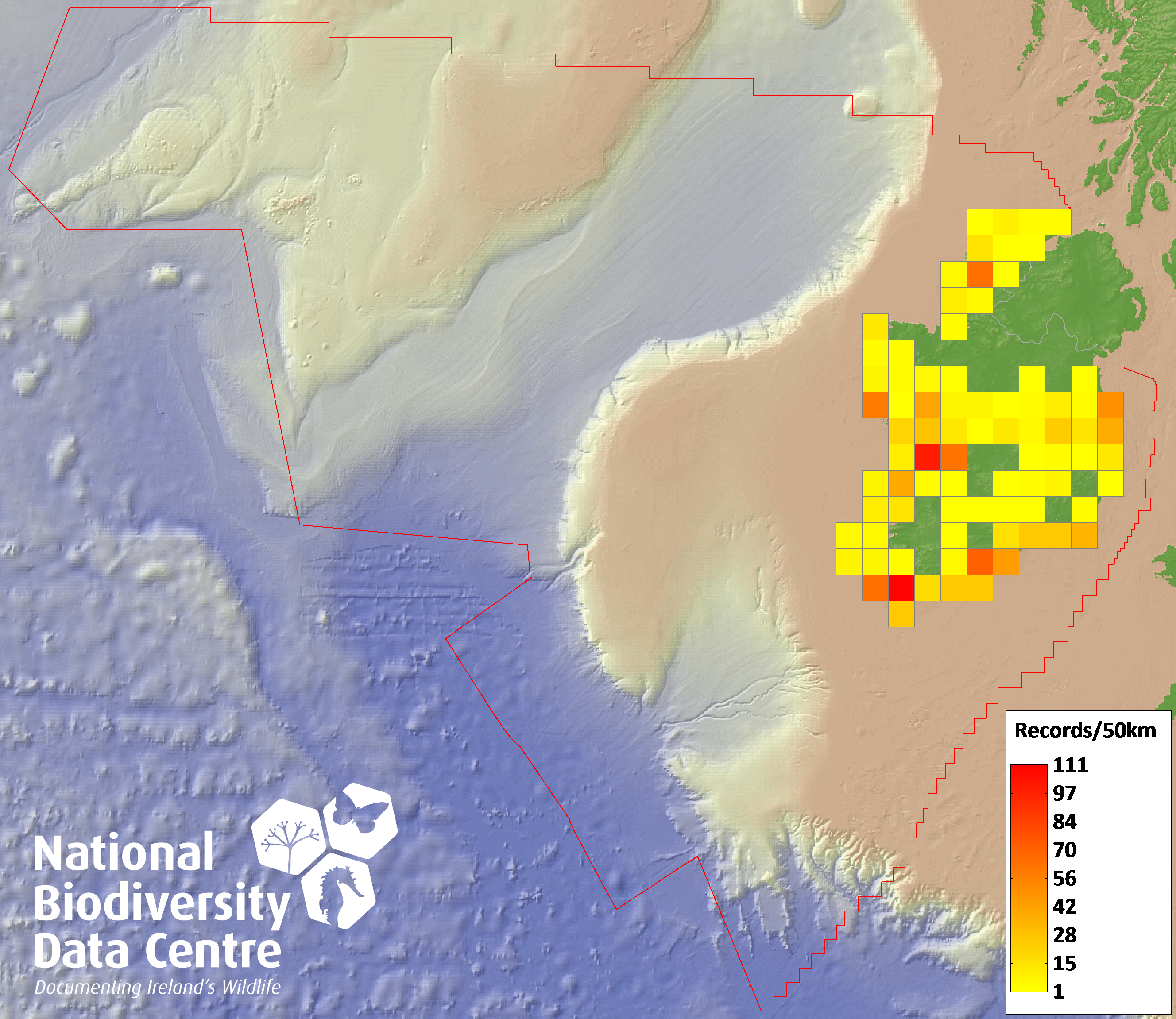 Distribution of the number of records recorded within each 10km grid square (ITM).Marine Map - 50km