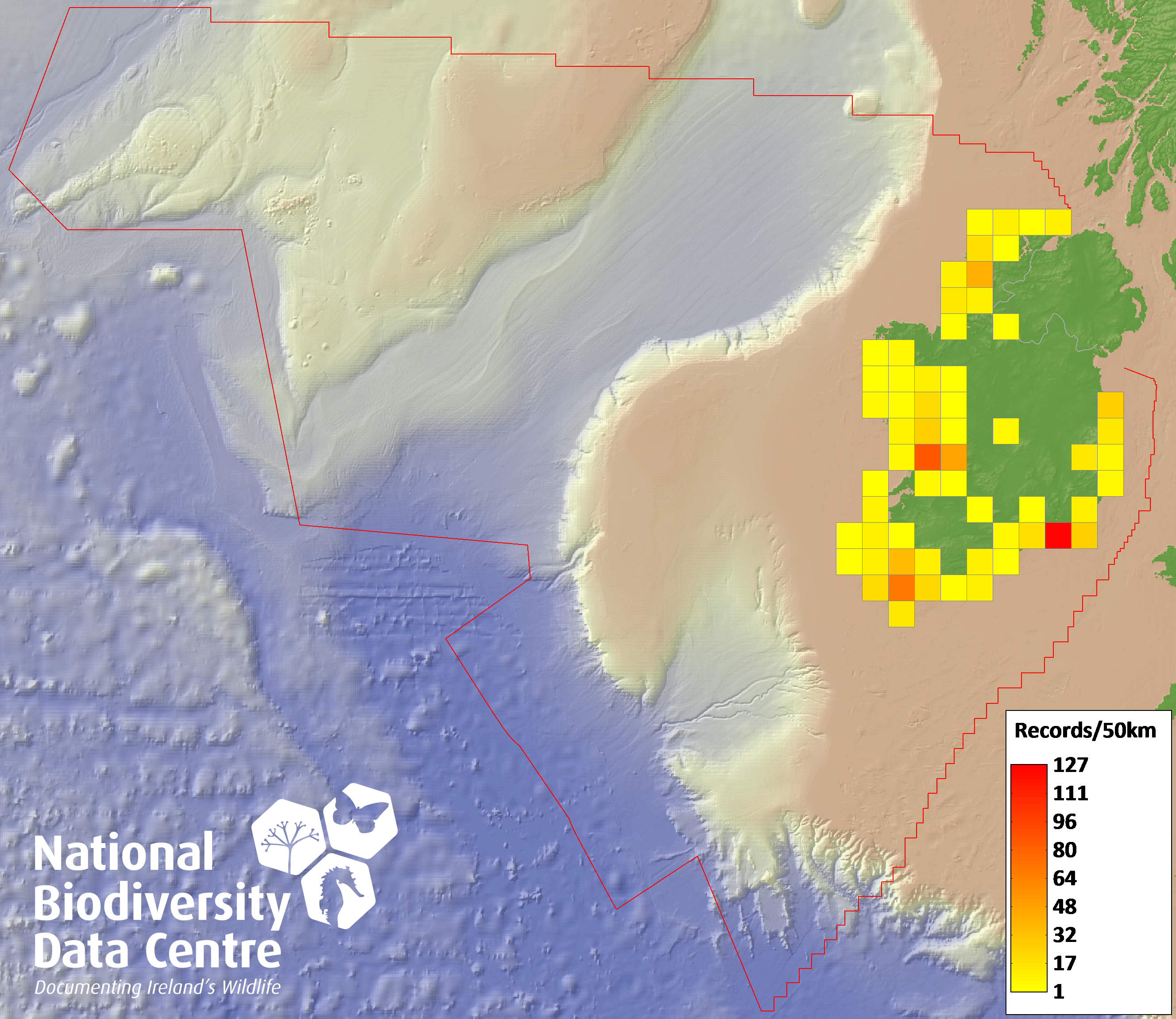 Distribution of the number of records recorded within each 10km grid square (ITM).Marine Map - 50km