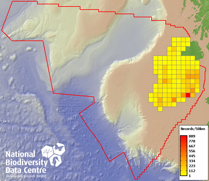 Distribution of the number of records recorded within each 10km grid square (ITM).Marine Map - 50km