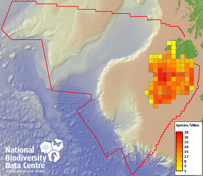 Distribution of the number of species recorded within each 10km grid square (ITM).Marine Map - 50Km