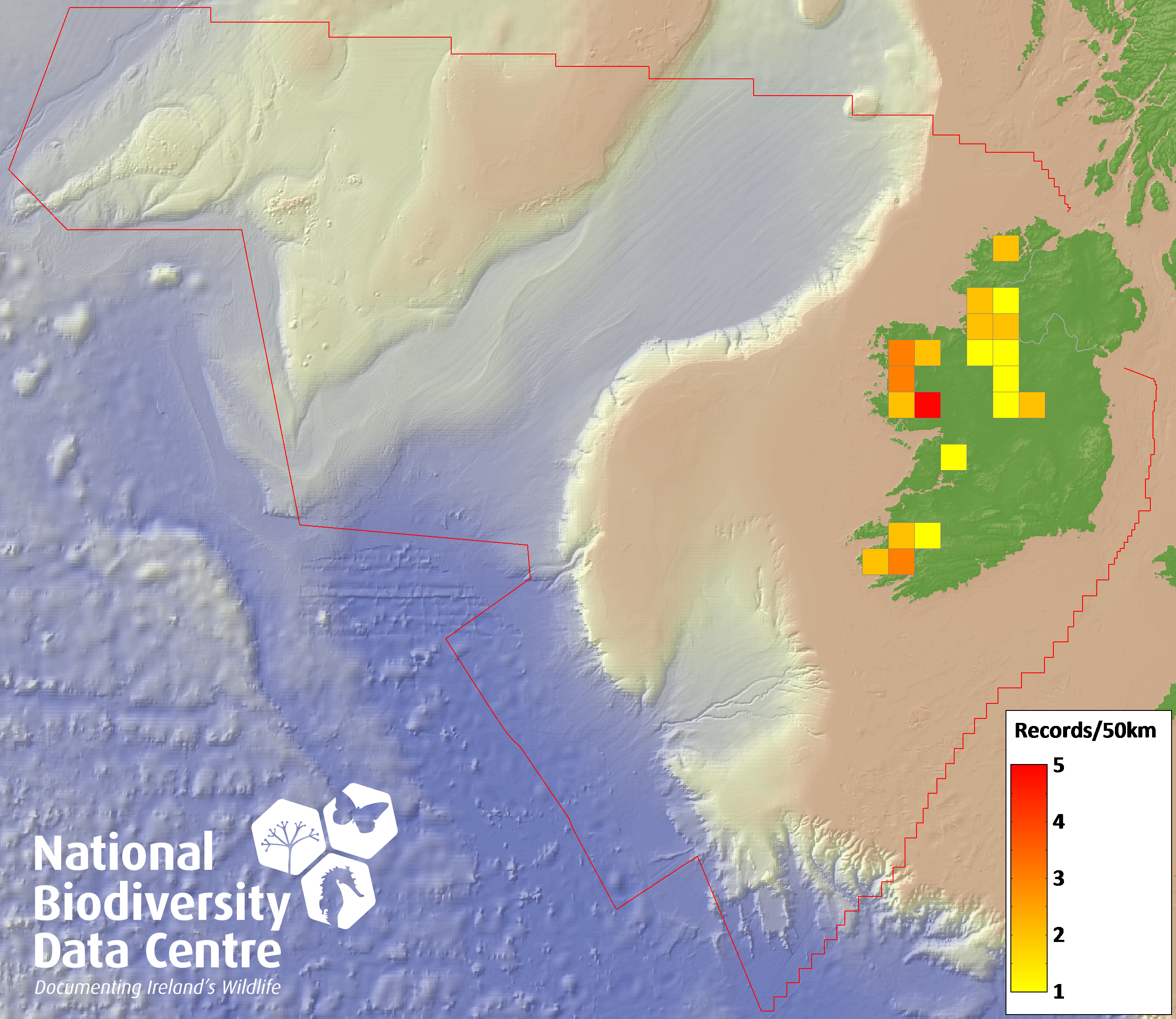Distribution of the number of records recorded within each 10km grid square (ITM).Marine Map - 50km