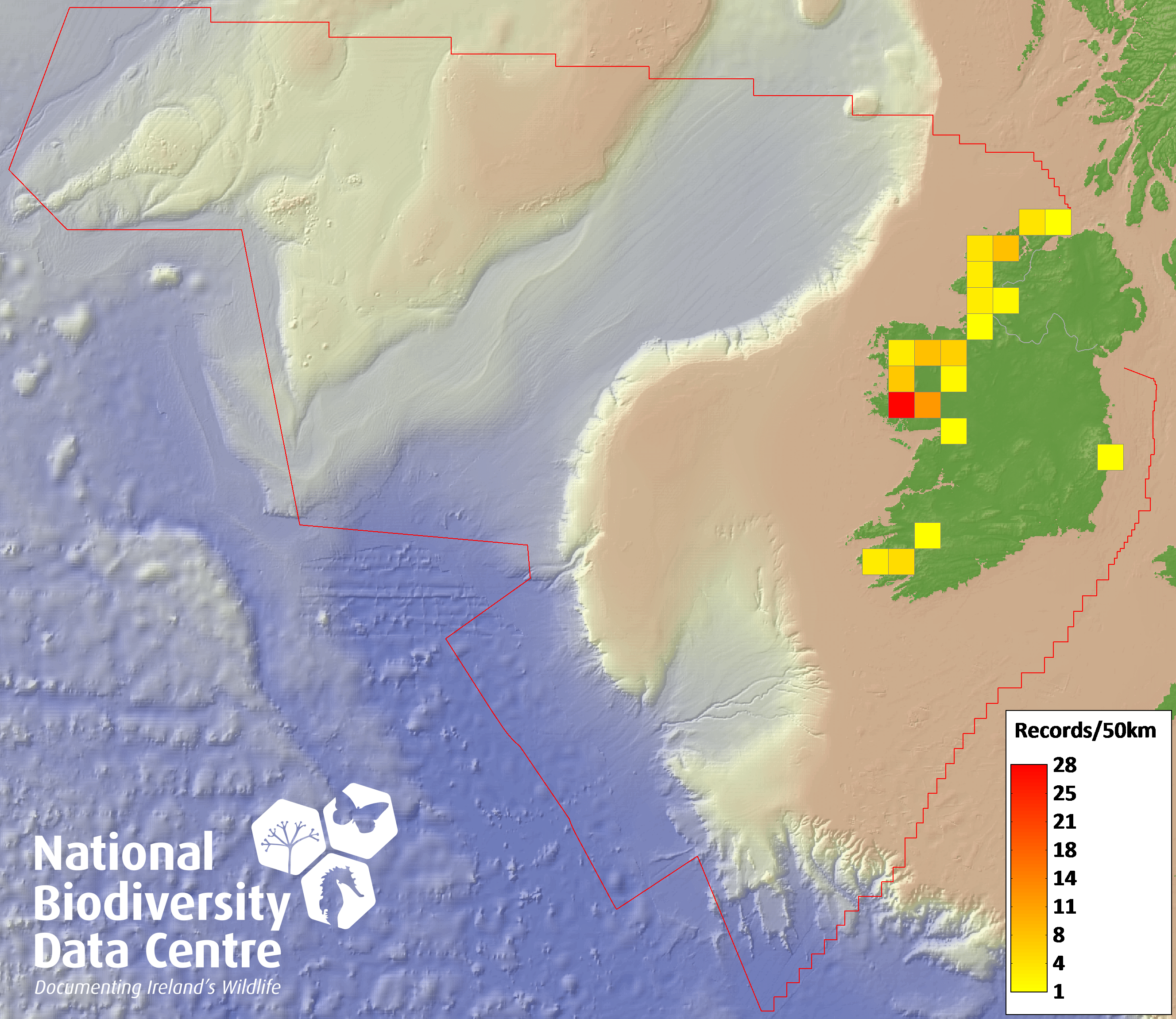 Distribution of the number of records recorded within each 10km grid square (ITM).Marine Map - 50km