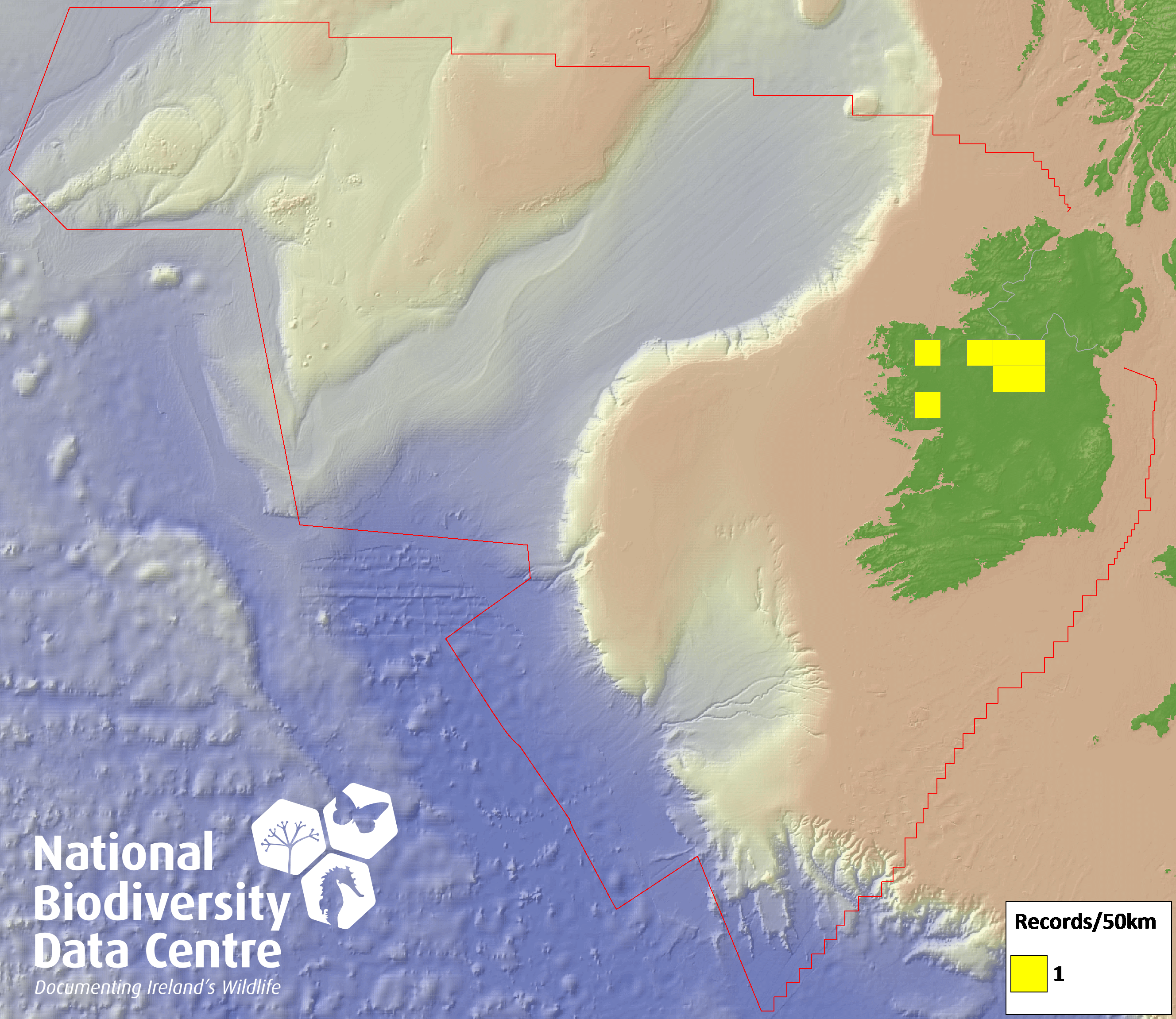 Distribution of the number of records recorded within each 10km grid square (ITM).Marine Map - 50km