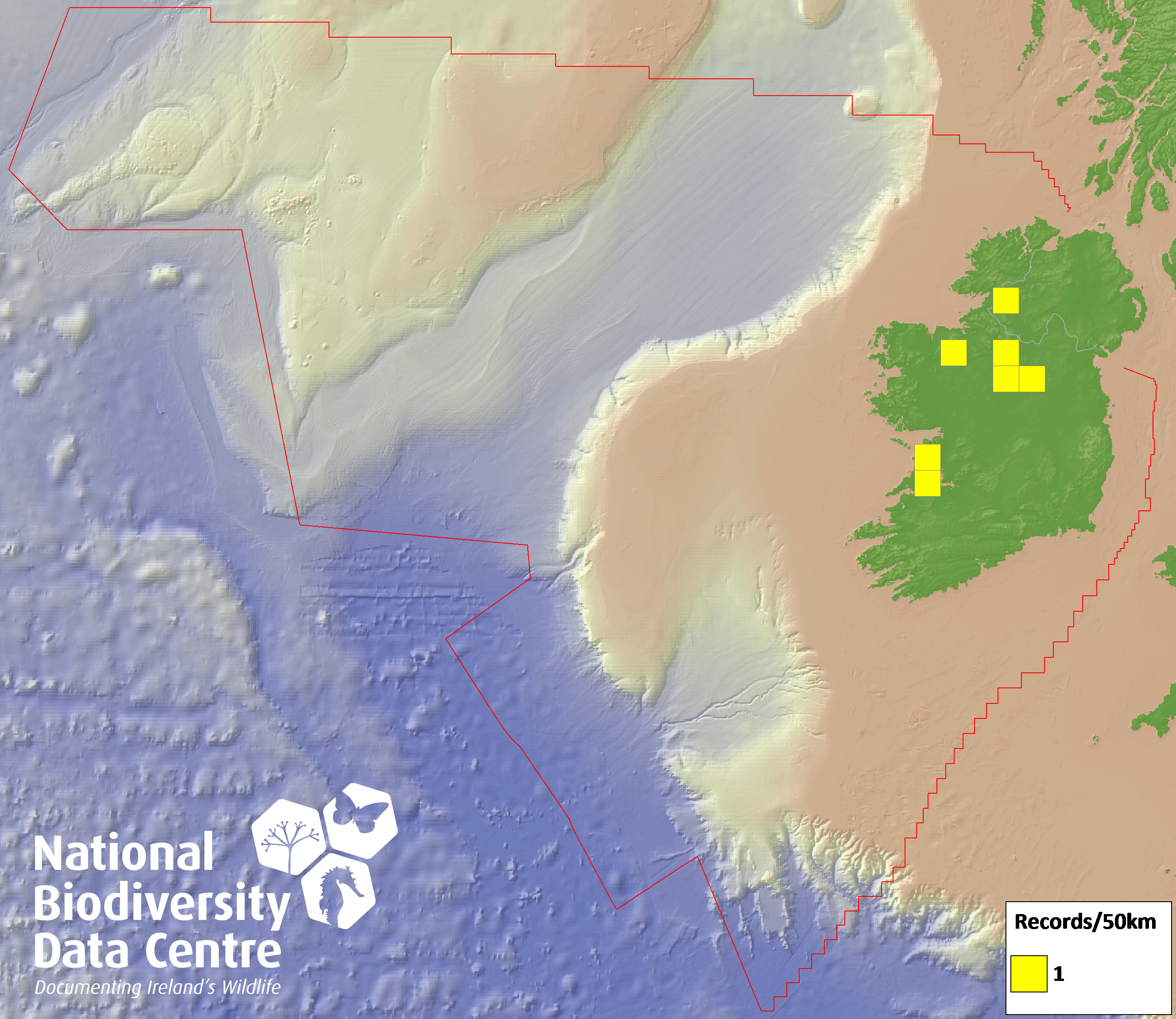 Distribution of the number of records recorded within each 10km grid square (ITM).Marine Map - 50km