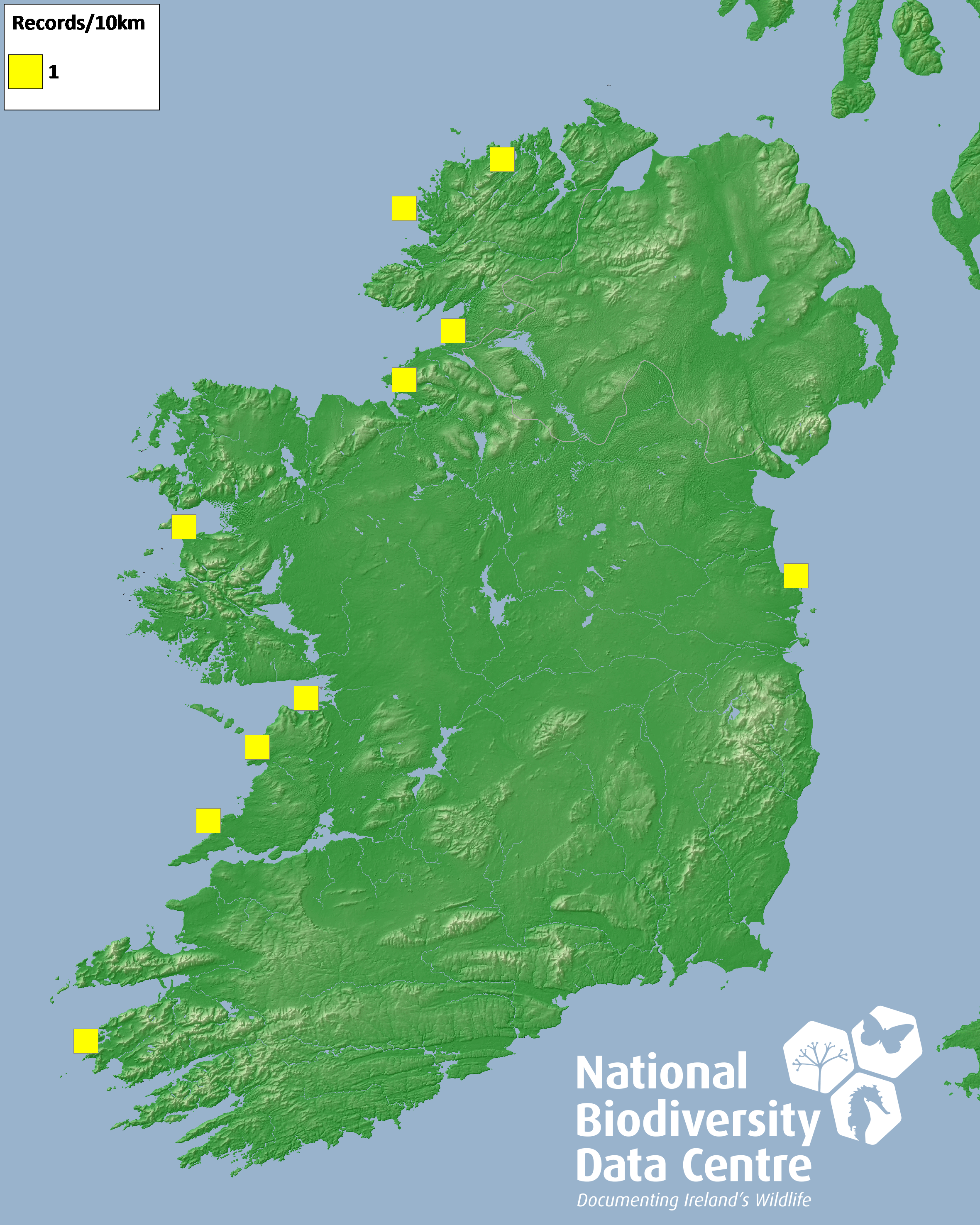 Distribution of the number of records recorded within each 10km grid square (ITM).Marine Map - 50km