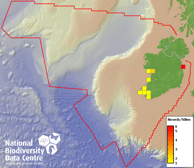 Distribution of the number of records recorded within each 10km grid square (ITM).Marine Map - 50km