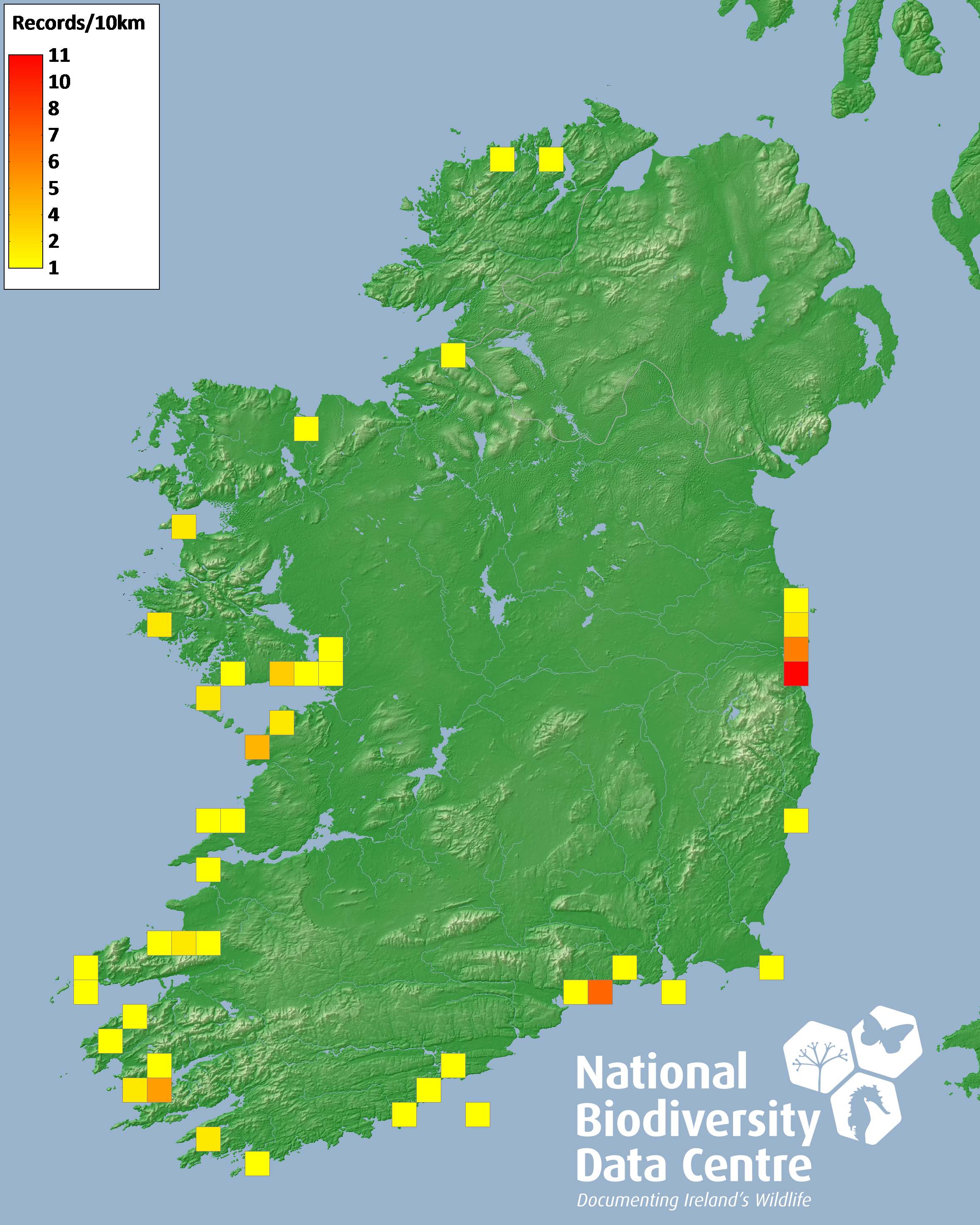Distribution of the number of records recorded within each 10km grid square (ITM).Marine Map - 50km