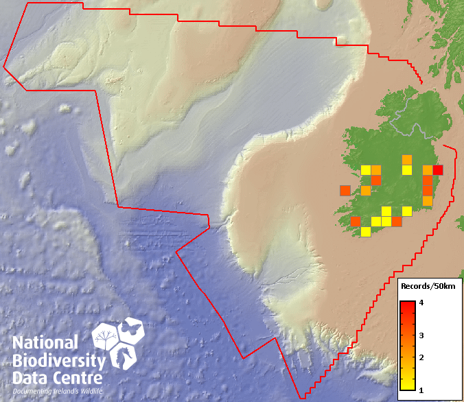 Distribution of the number of records recorded within each 10km grid square (ITM).Marine Map - 50km