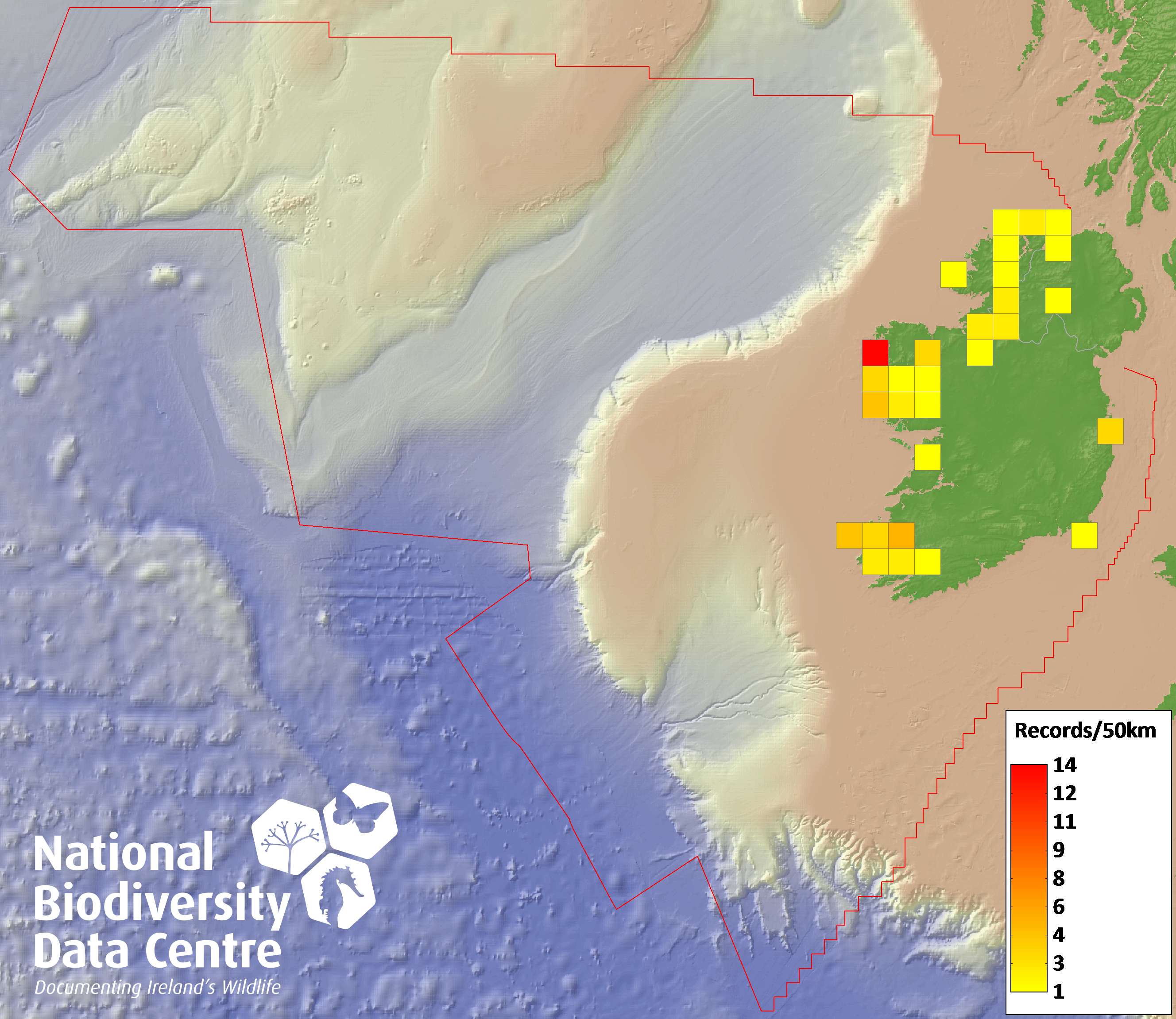 Distribution of the number of records recorded within each 10km grid square (ITM).Marine Map - 50km