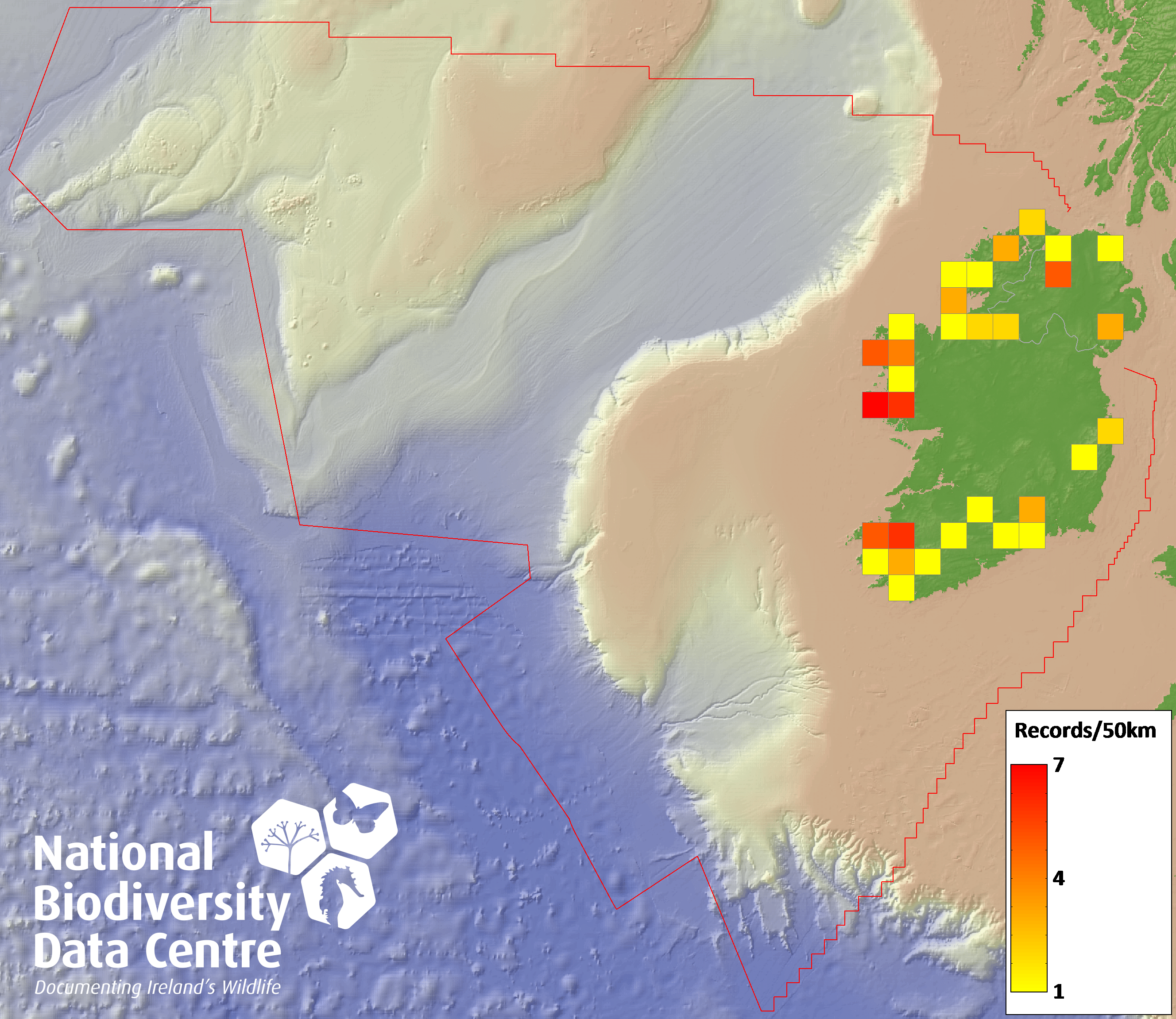 Distribution of the number of records recorded within each 10km grid square (ITM).Marine Map - 50km