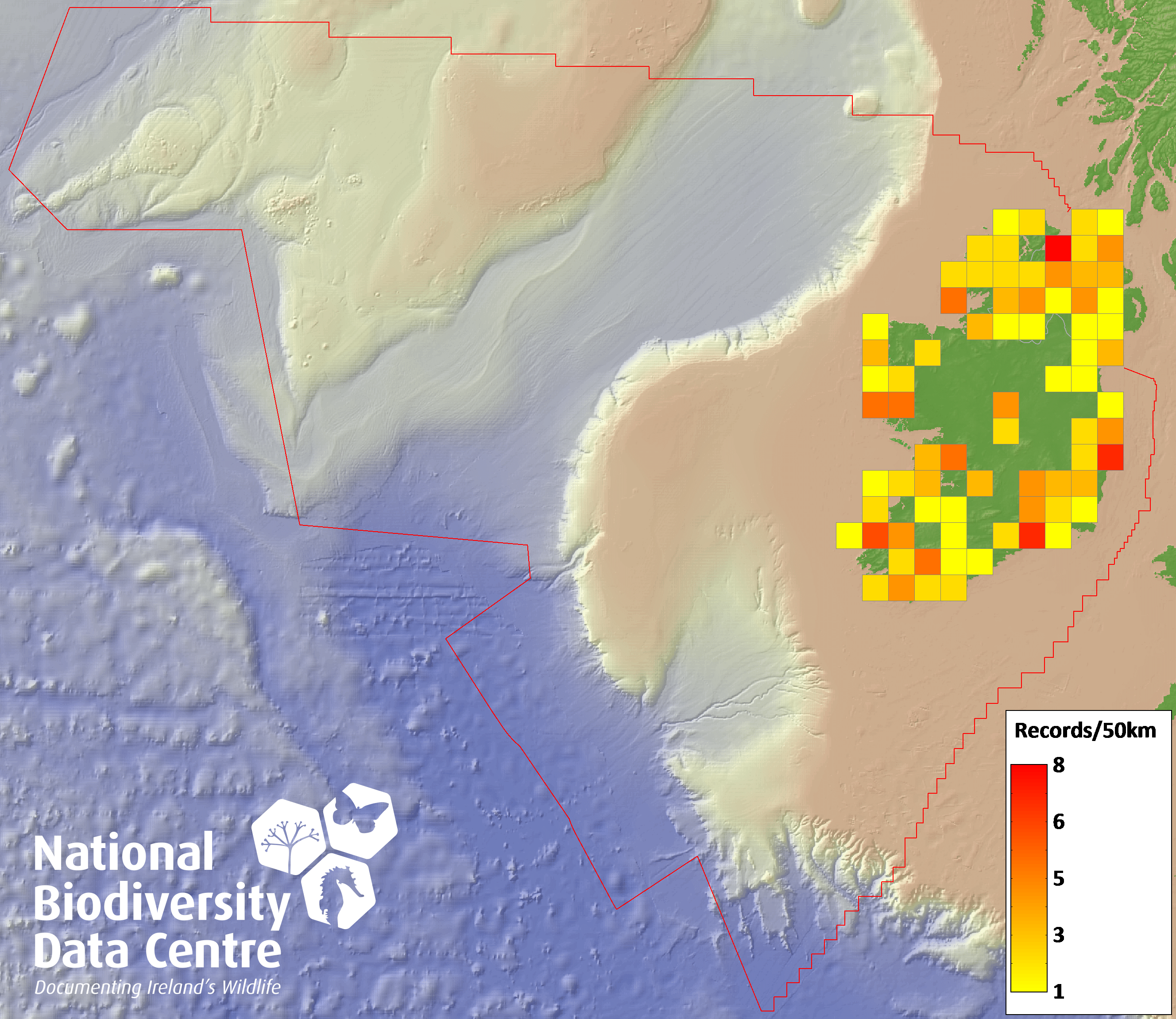 Distribution of the number of records recorded within each 10km grid square (ITM).Marine Map - 50km