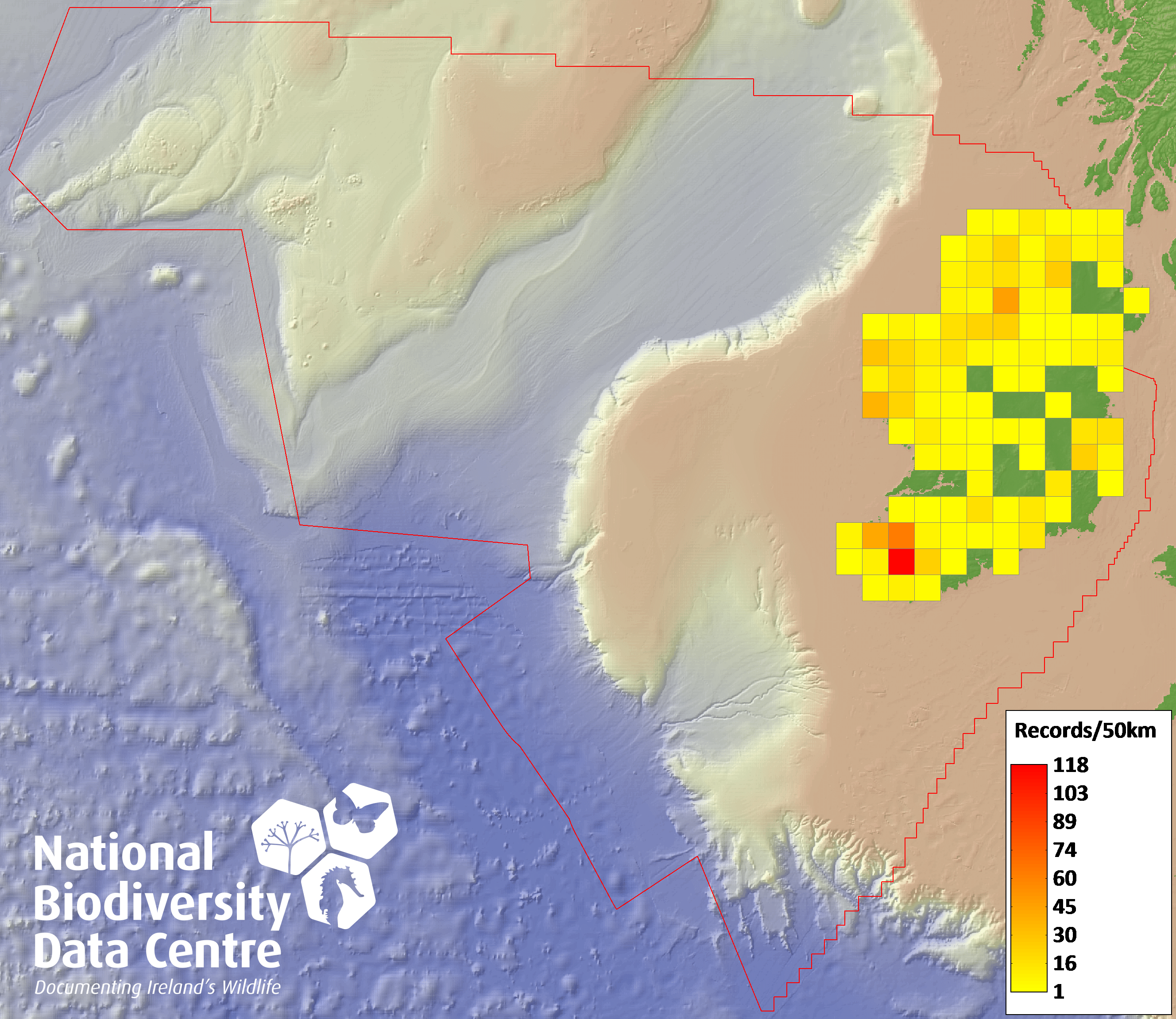 Distribution of the number of records recorded within each 10km grid square (ITM).Marine Map - 50km