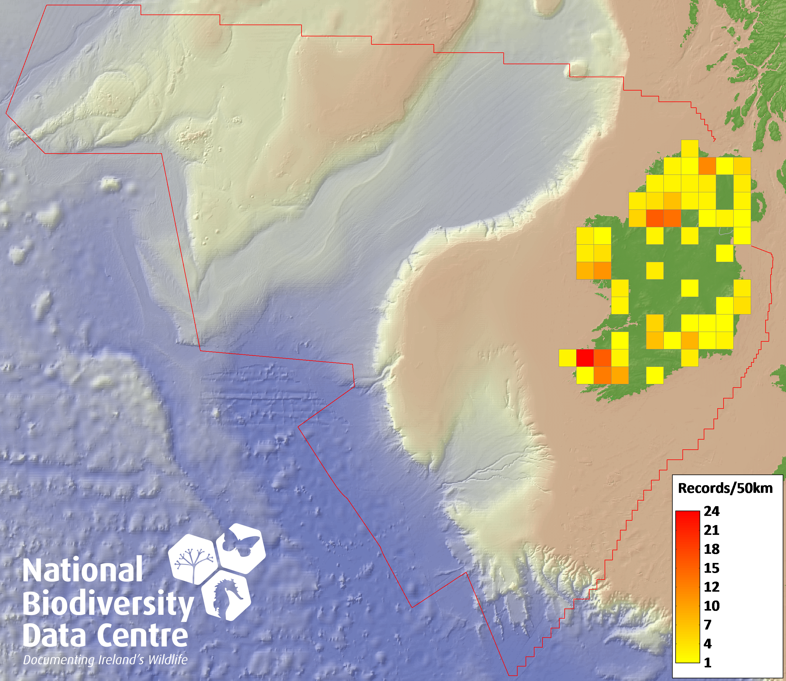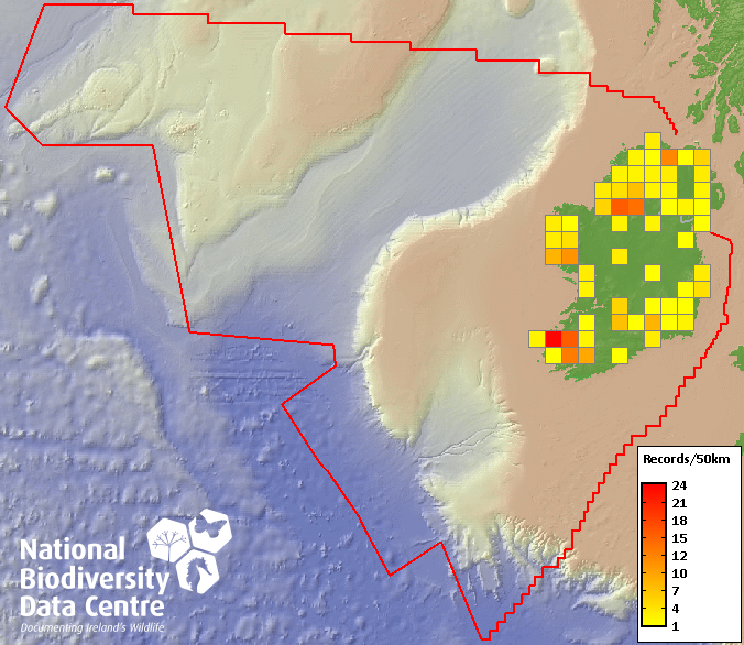 Distribution of the number of records recorded within each 10km grid square (ITM).Marine Map - 50km