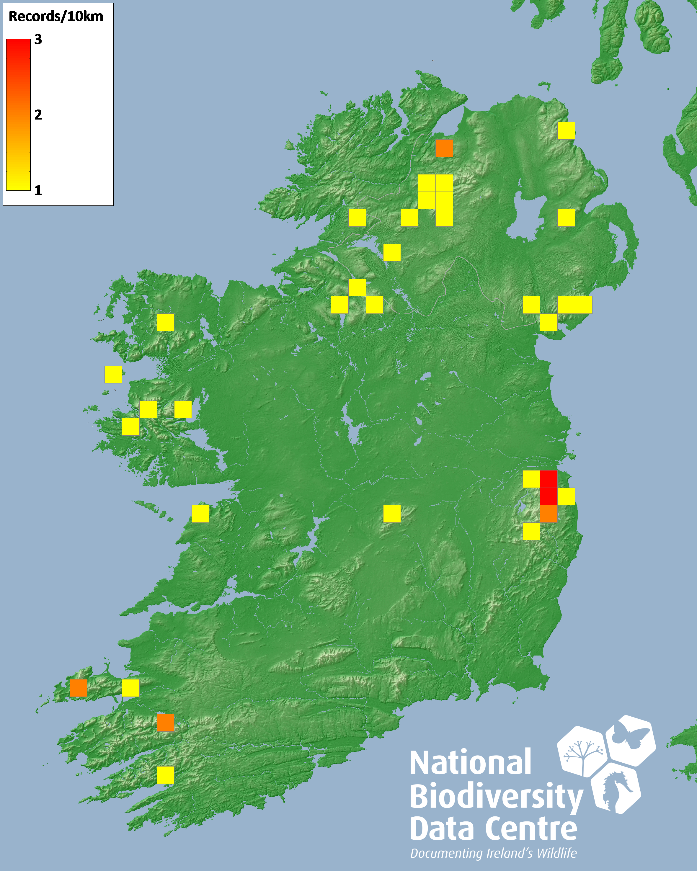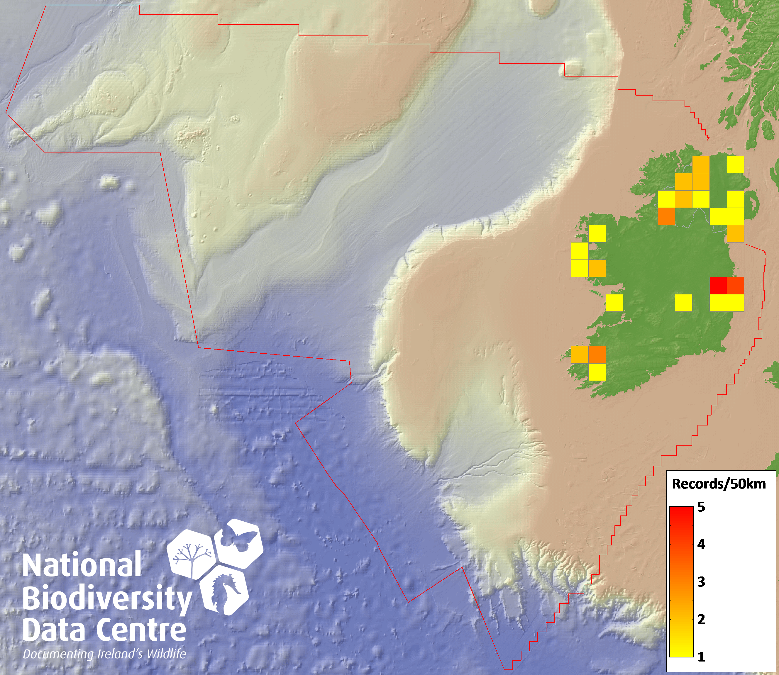 Distribution of the number of records recorded within each 10km grid square (ITM).Marine Map - 50km