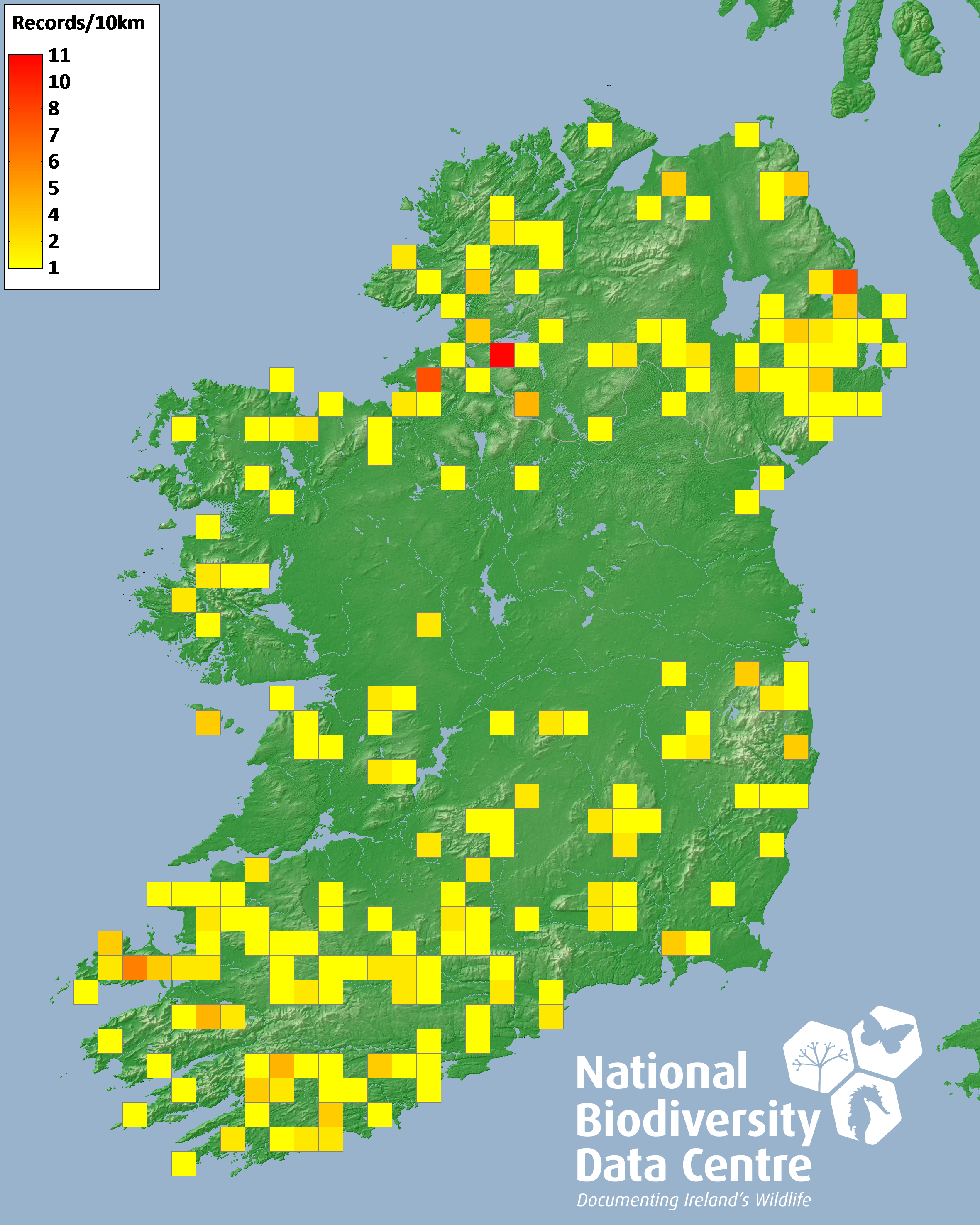 Distribution of the number of records recorded within each 10km grid square (ITM).Marine Map - 50km