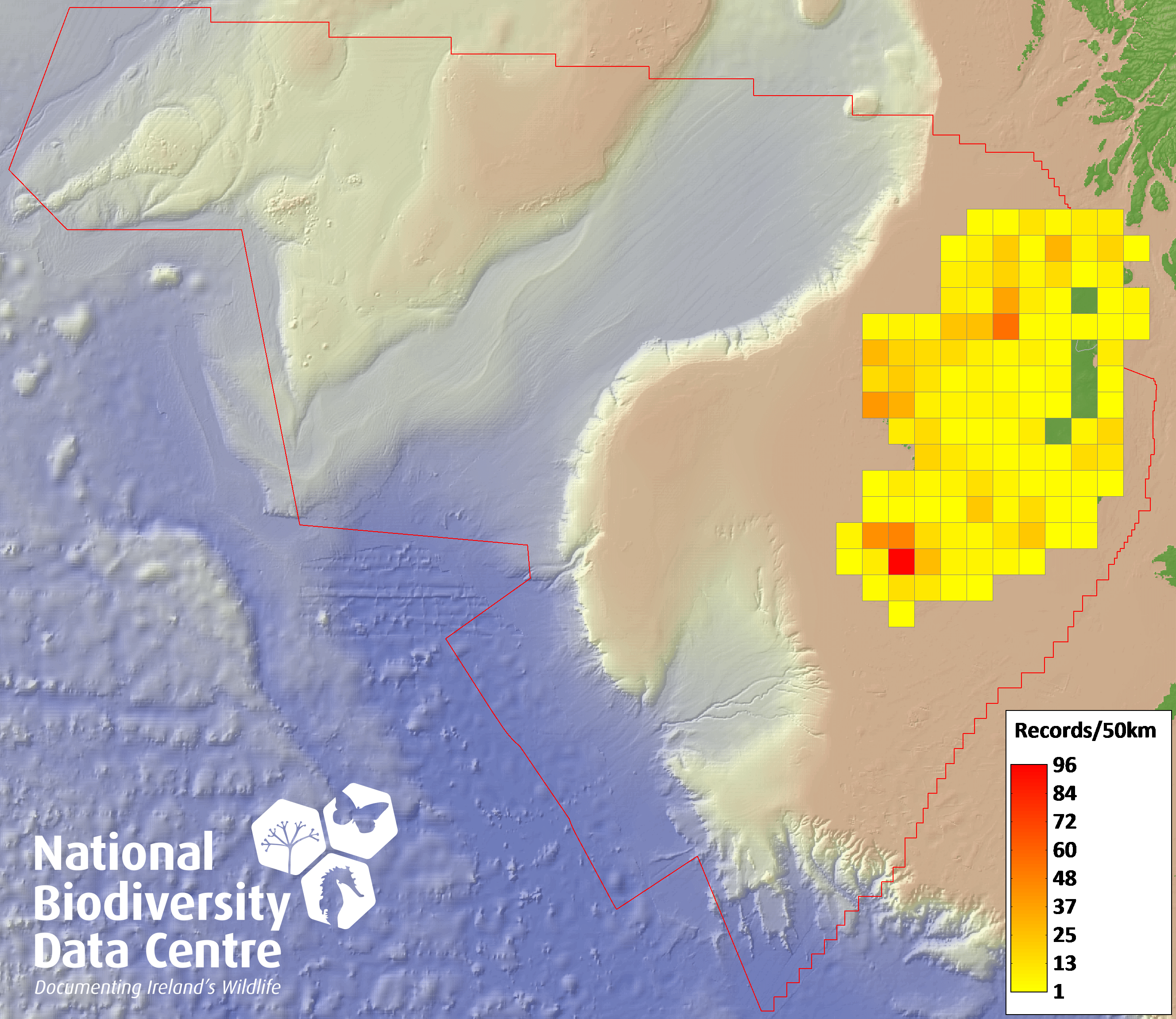 Distribution of the number of records recorded within each 10km grid square (ITM).Marine Map - 50km