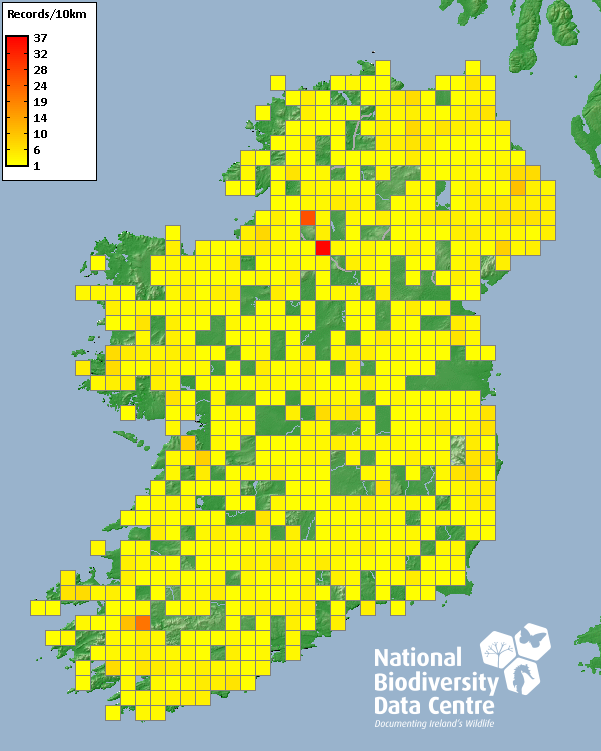 Distribution of the number of records recorded within each 10km grid square (ITM).Marine Map - 50km
