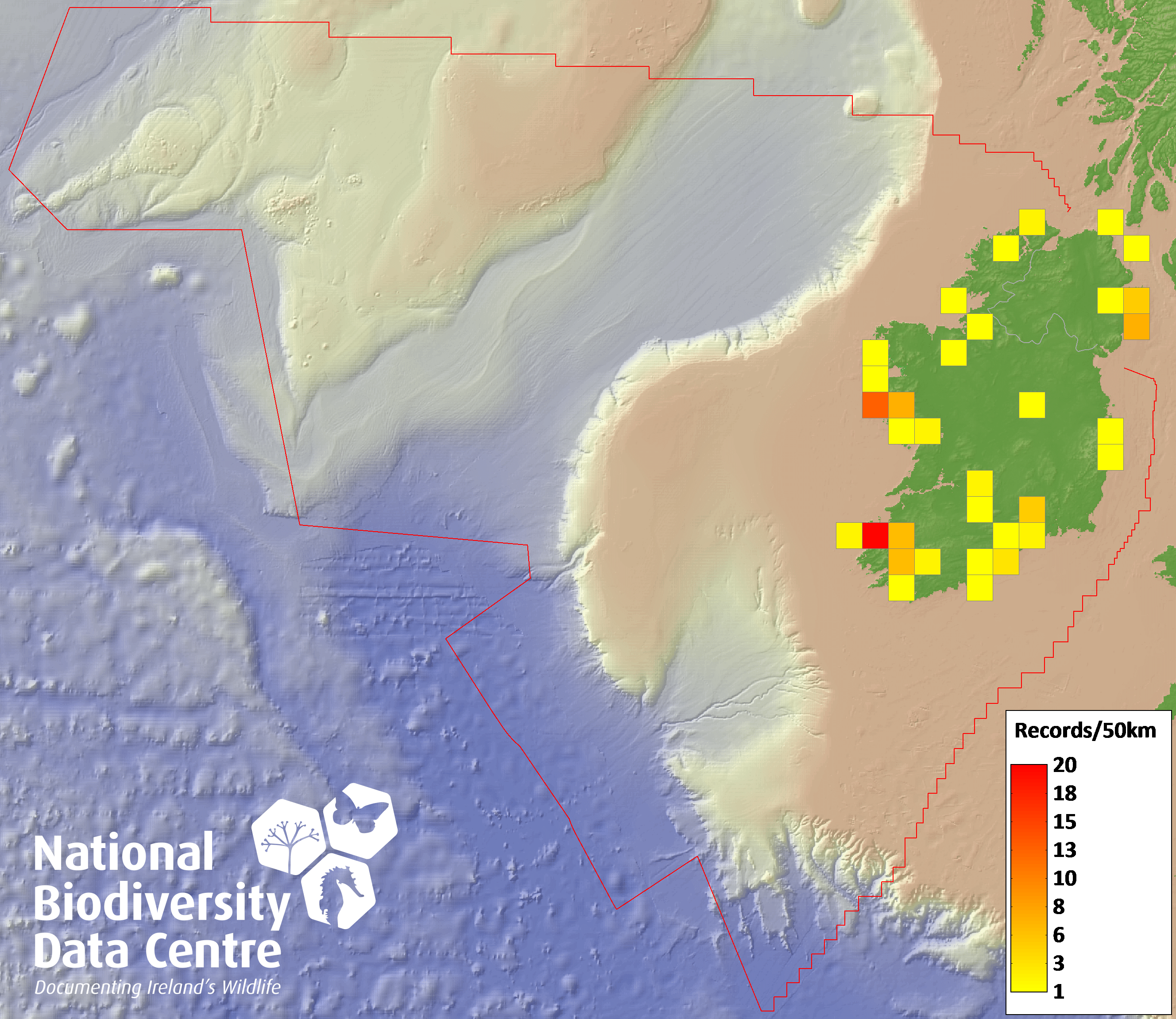 Distribution of the number of records recorded within each 10km grid square (ITM).Marine Map - 50km