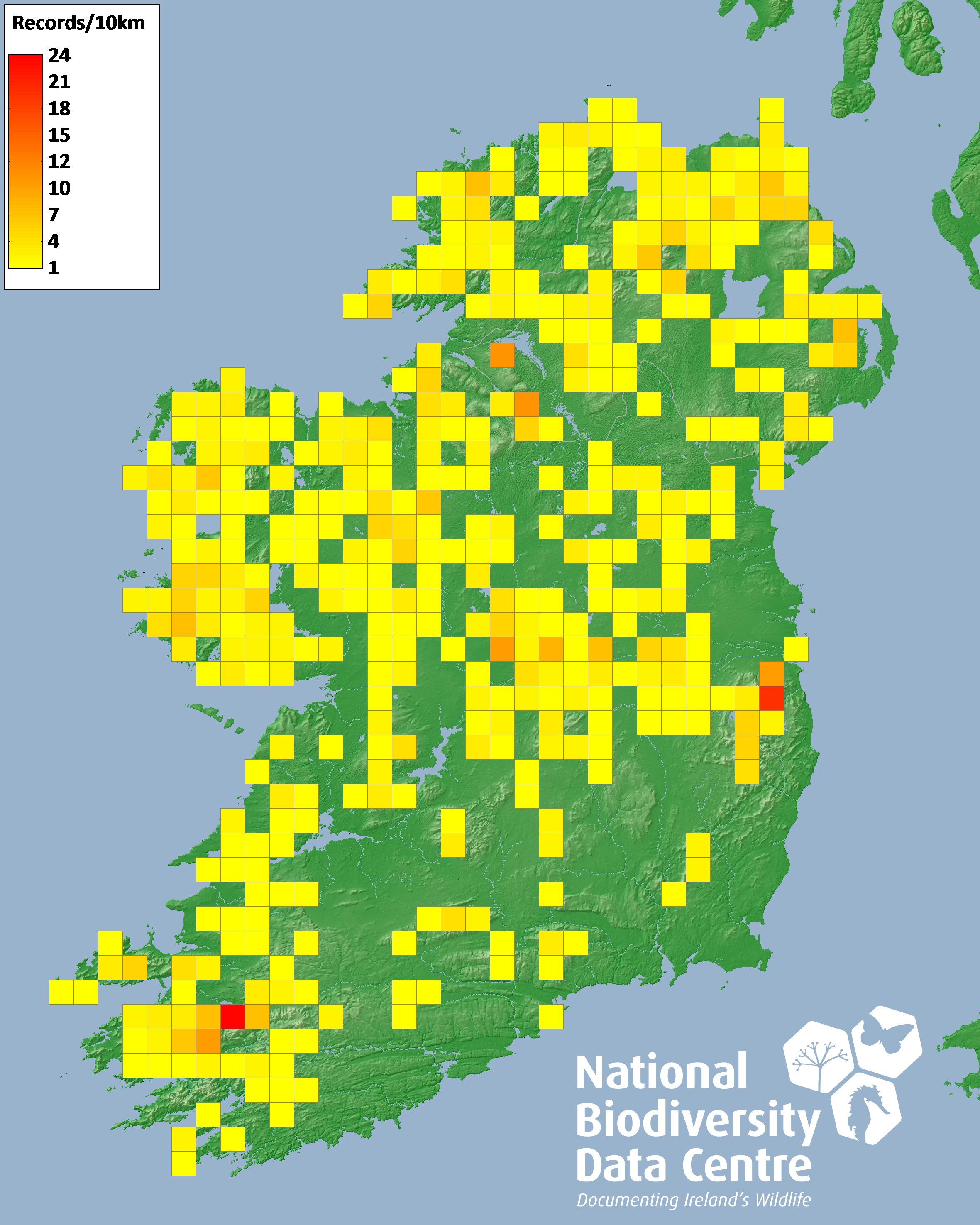 Distribution of the number of records recorded within each 10km grid square (ITM).Marine Map - 50km