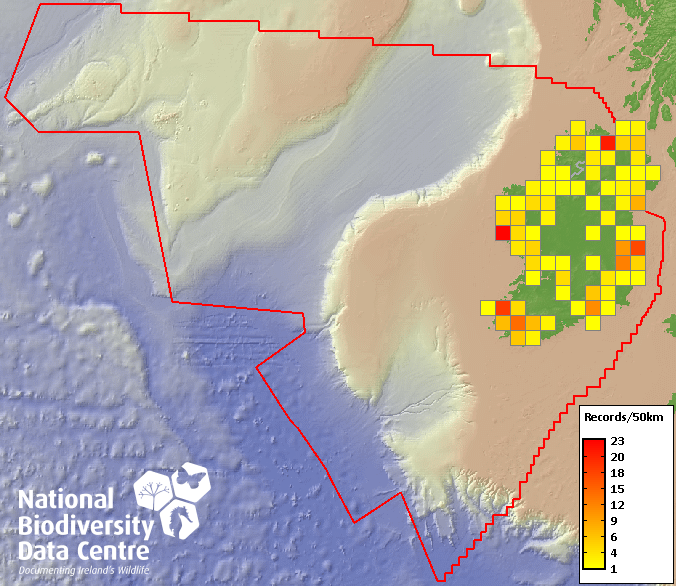 Distribution of the number of records recorded within each 10km grid square (ITM).Marine Map - 50km