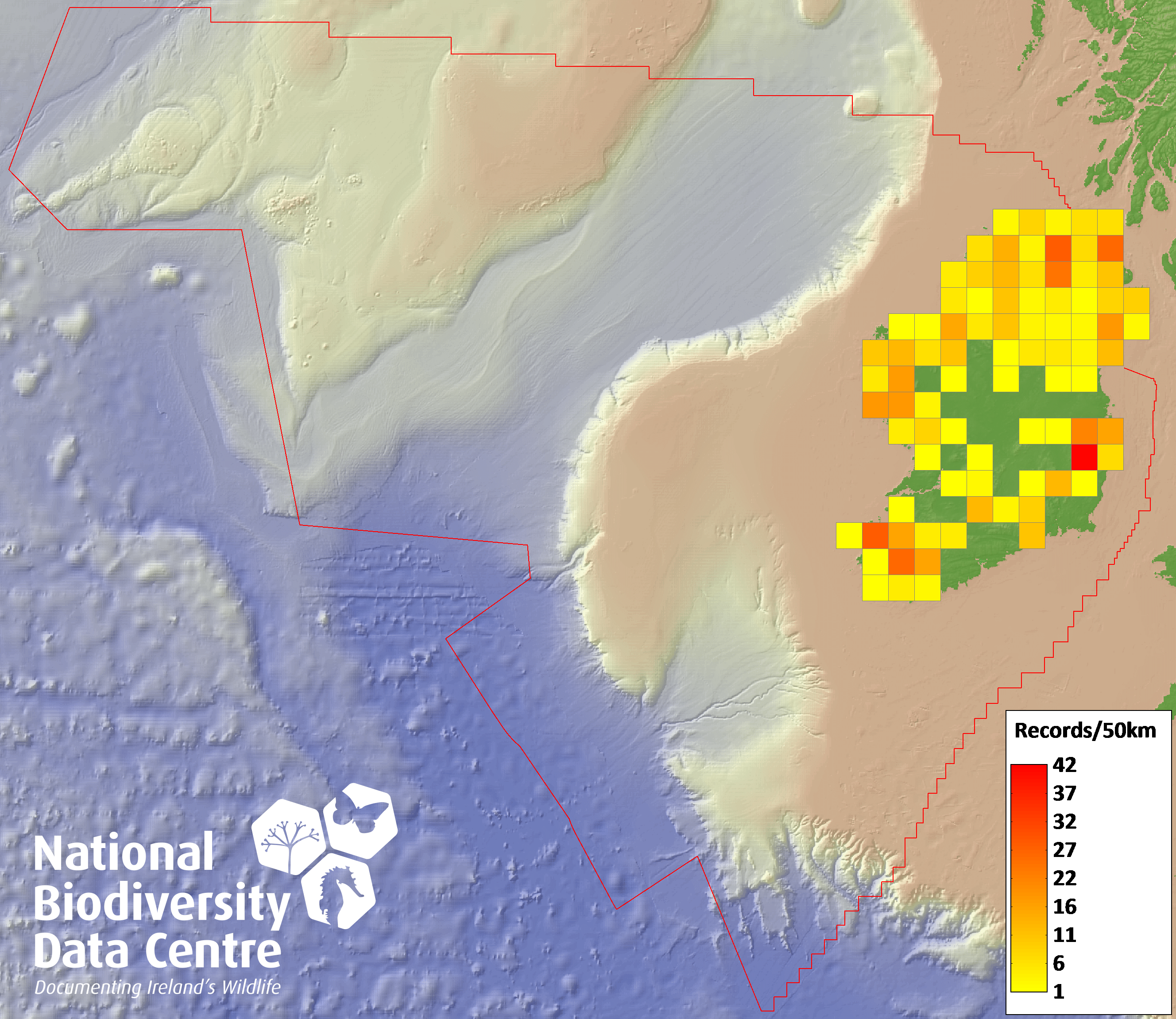 Distribution of the number of records recorded within each 10km grid square (ITM).Marine Map - 50km