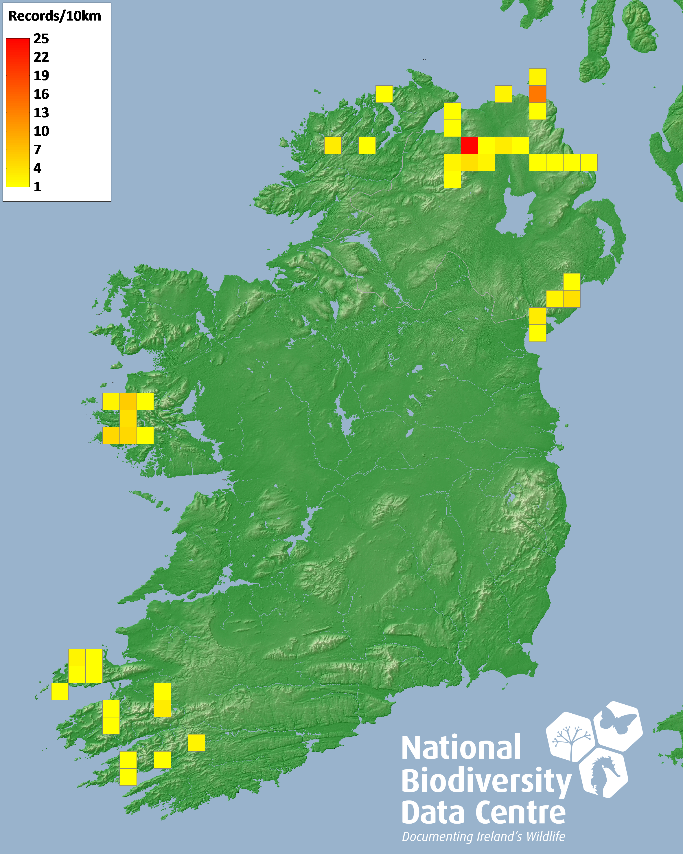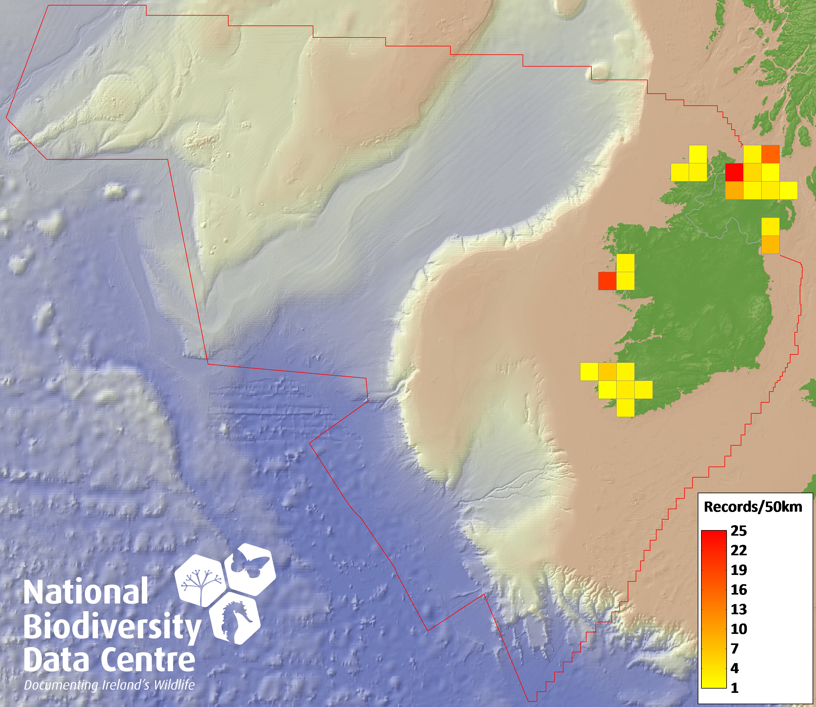 Distribution of the number of records recorded within each 10km grid square (ITM).Marine Map - 50km