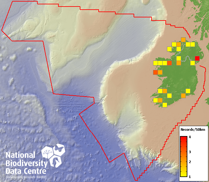 Distribution of the number of records recorded within each 10km grid square (ITM).Marine Map - 50km