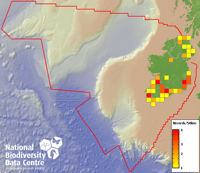 Distribution of the number of records recorded within each 10km grid square (ITM).Marine Map - 50km