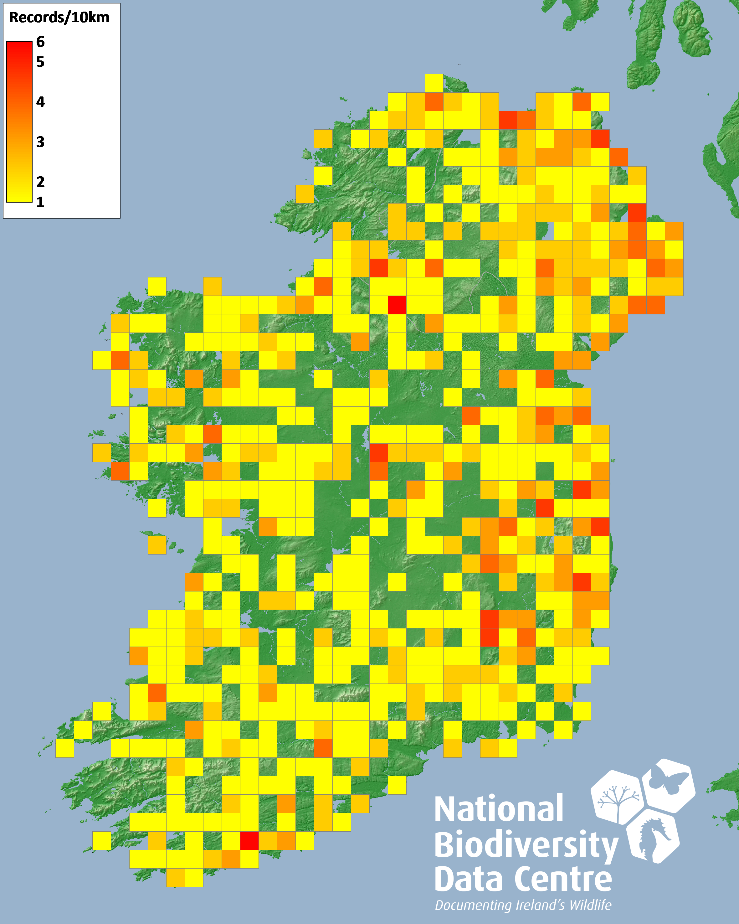 Distribution of the number of records recorded within each 10km grid square (ITM).Marine Map - 50km