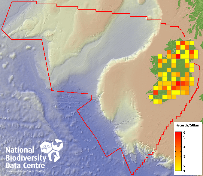 Distribution of the number of records recorded within each 10km grid square (ITM).Marine Map - 50km