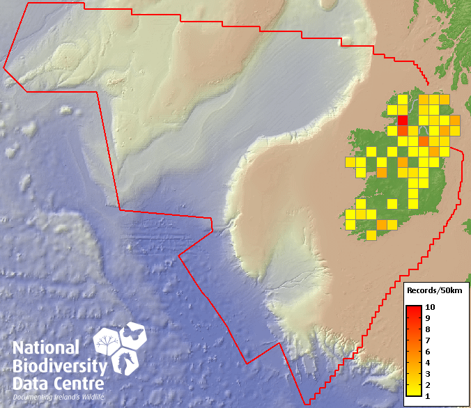 Distribution of the number of records recorded within each 10km grid square (ITM).Marine Map - 50km