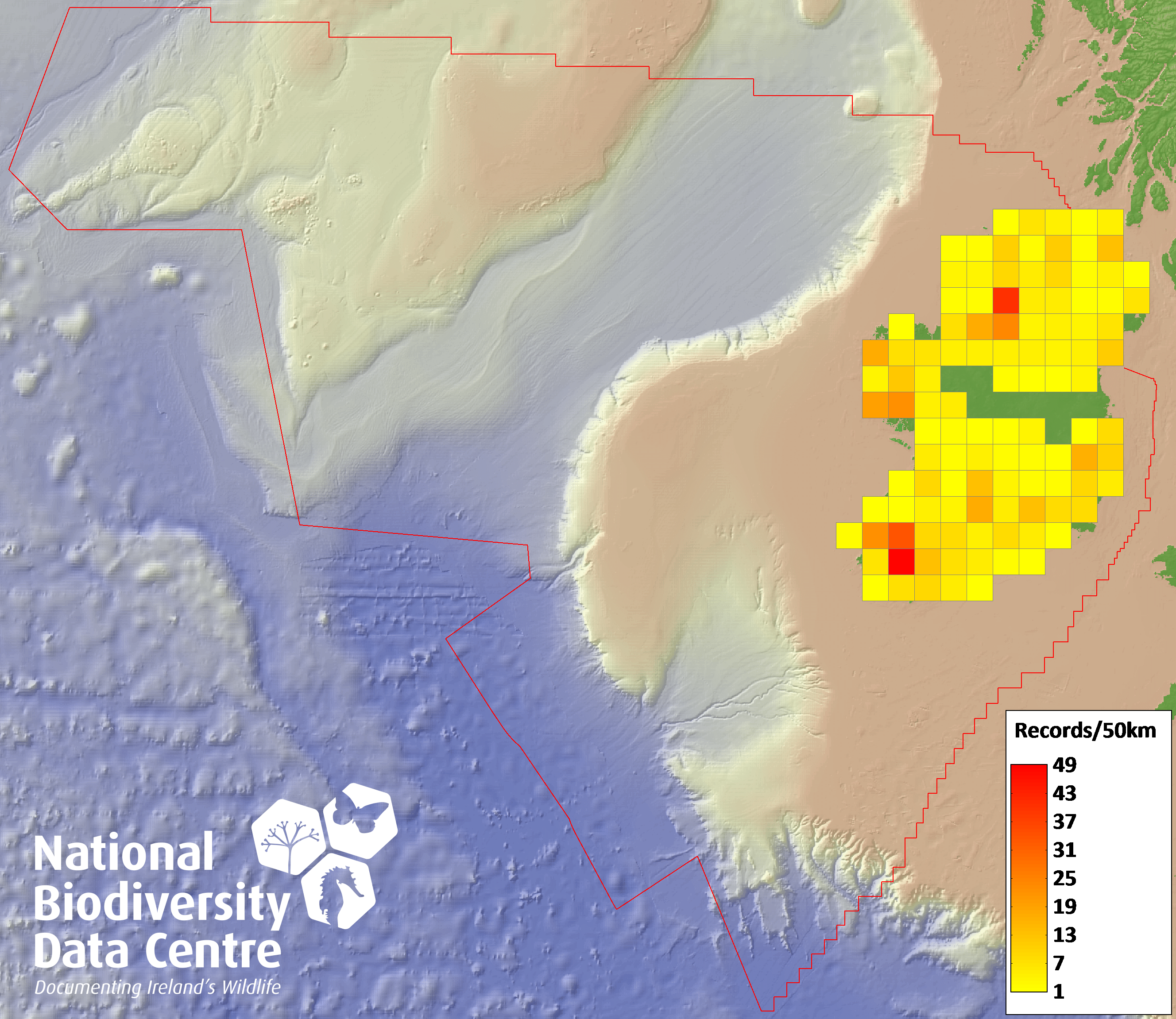Distribution of the number of records recorded within each 10km grid square (ITM).Marine Map - 50km