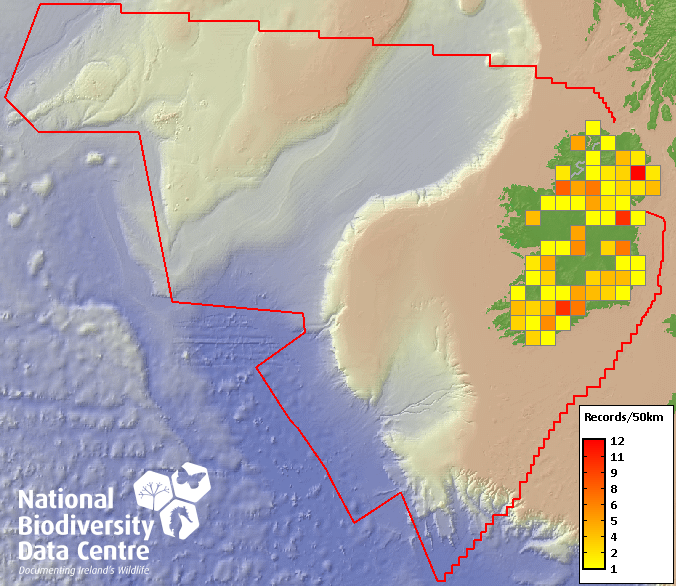 Distribution of the number of records recorded within each 10km grid square (ITM).Marine Map - 50km