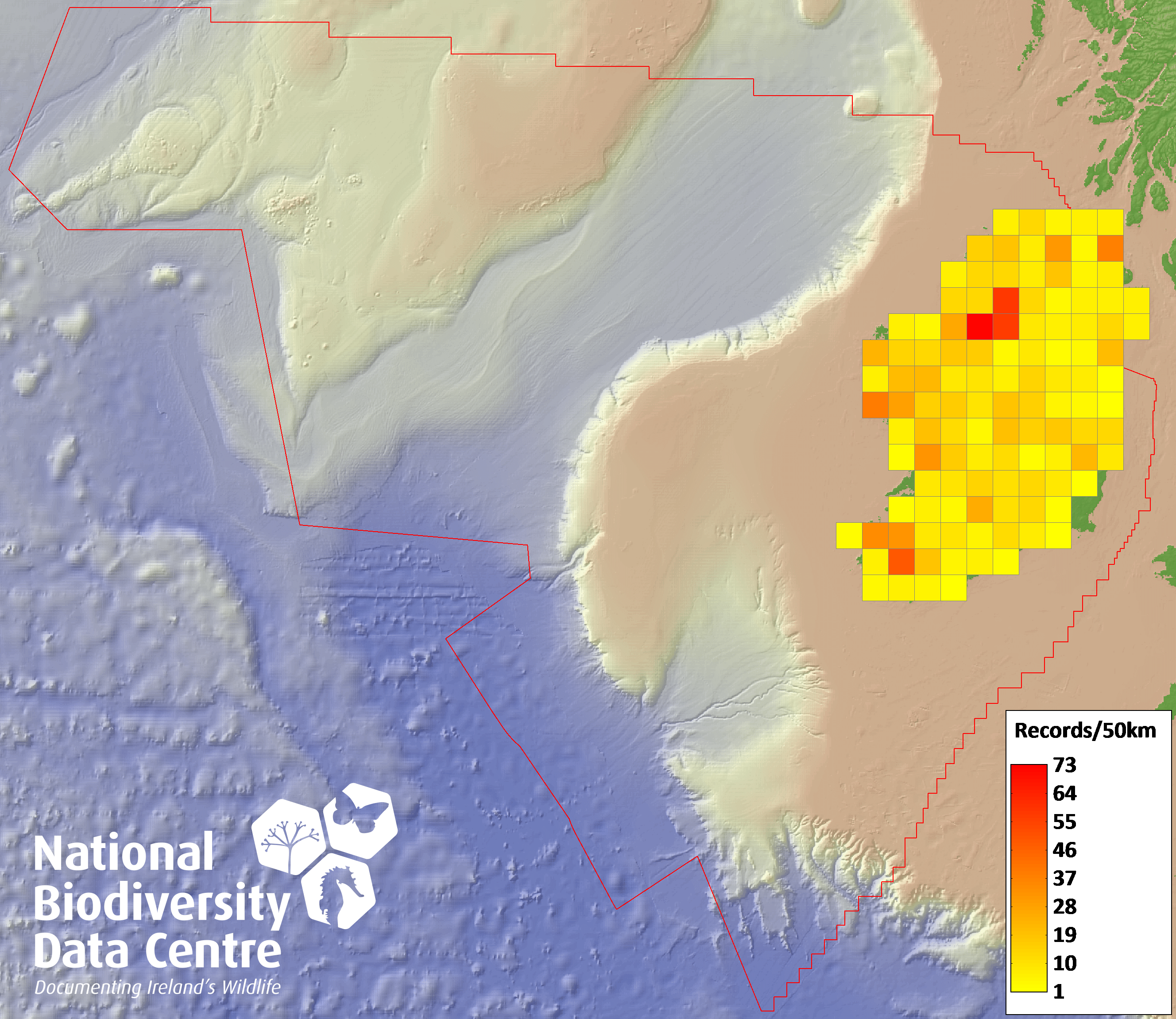 Distribution of the number of records recorded within each 10km grid square (ITM).Marine Map - 50km