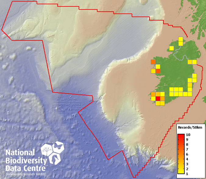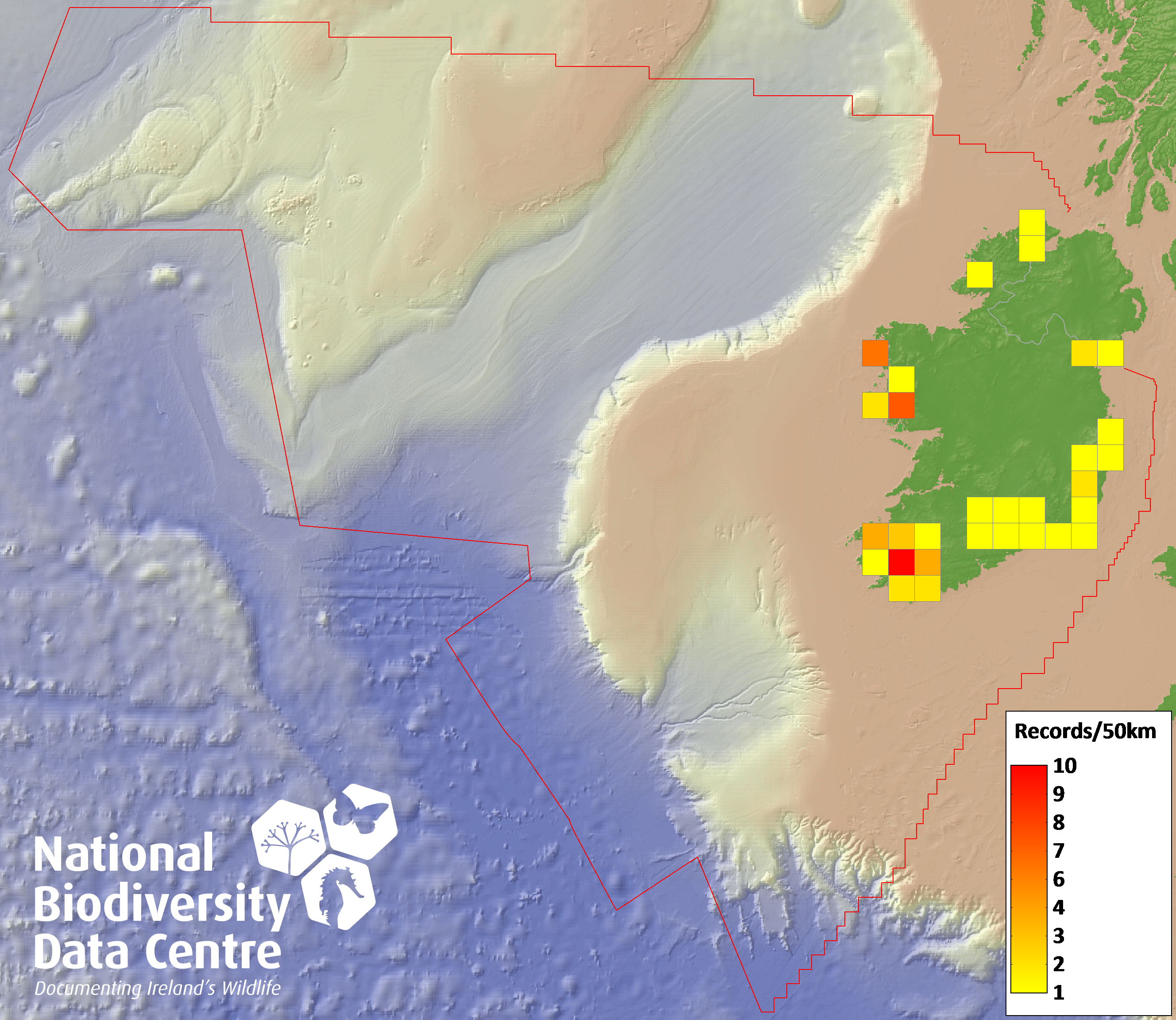 Distribution of the number of records recorded within each 10km grid square (ITM).Marine Map - 50km