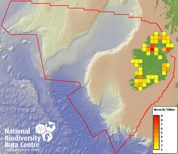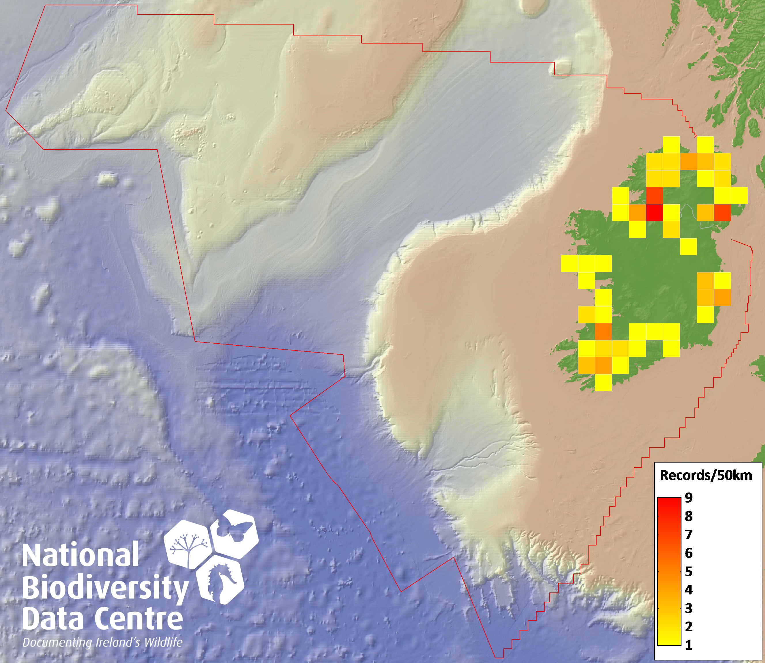 Distribution of the number of records recorded within each 10km grid square (ITM).Marine Map - 50km