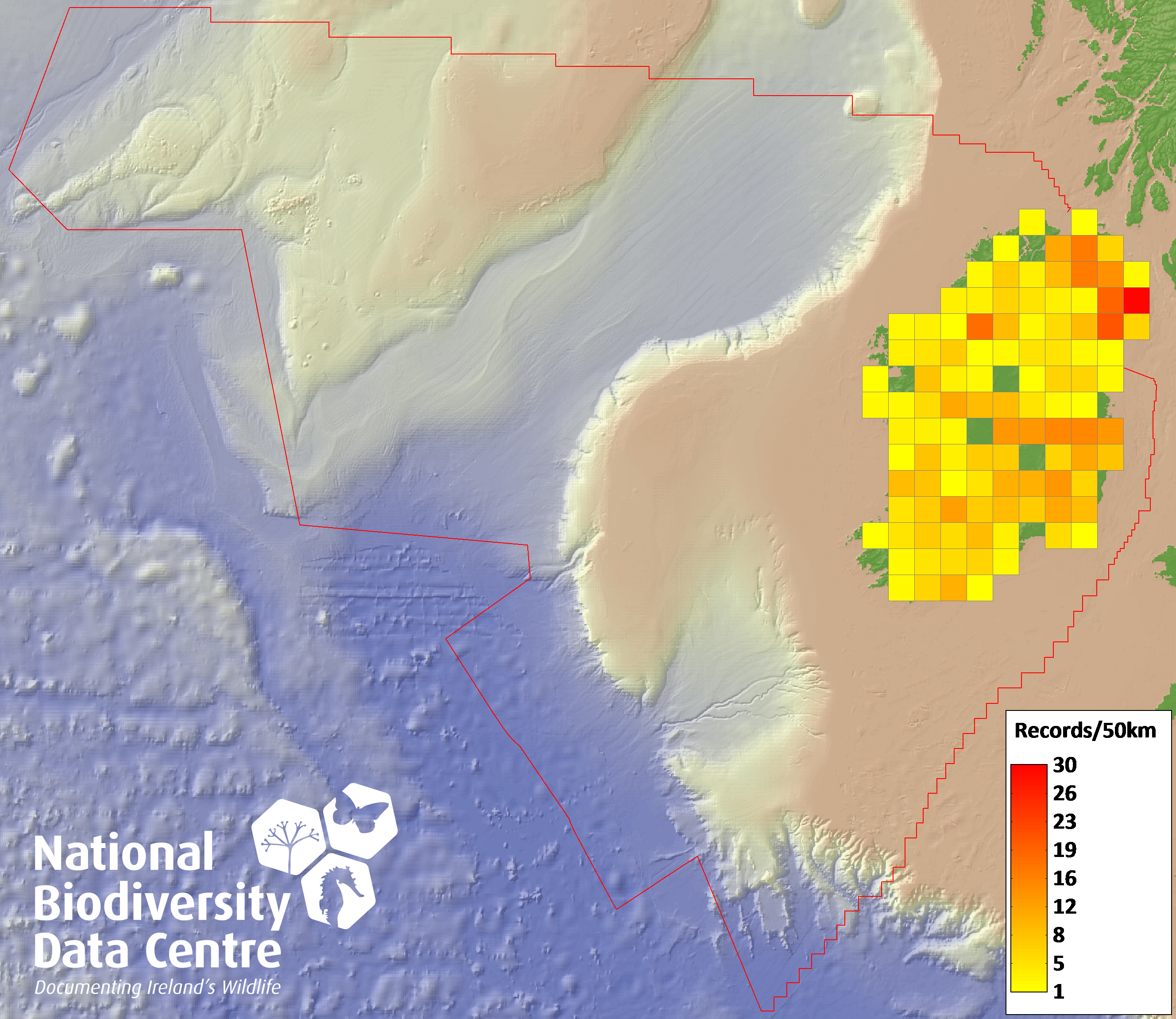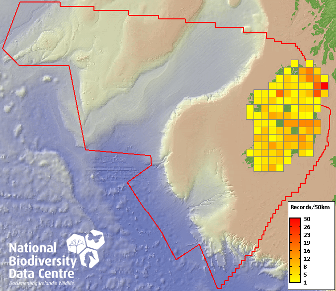Distribution of the number of records recorded within each 10km grid square (ITM).Marine Map - 50km