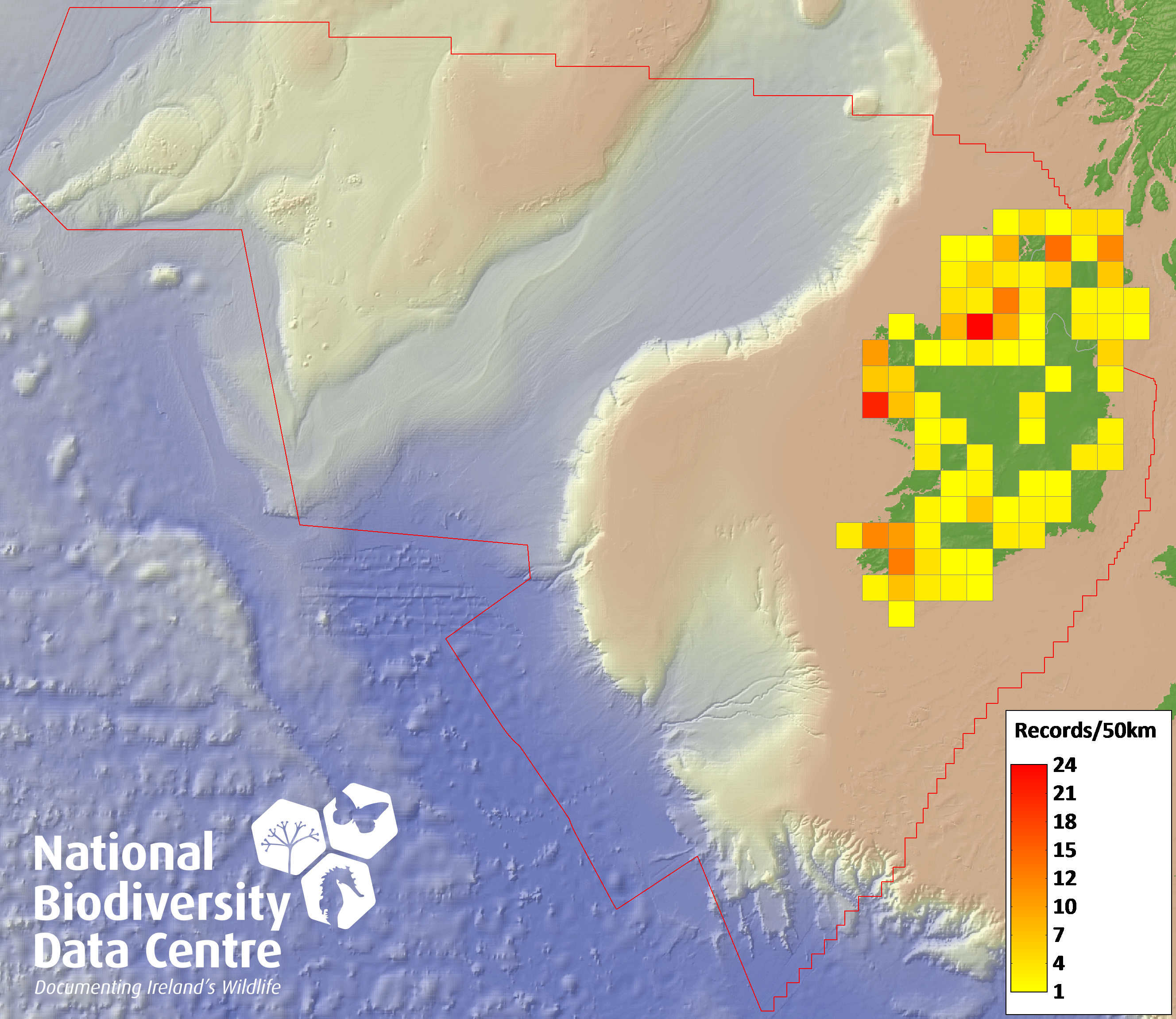 Distribution of the number of records recorded within each 10km grid square (ITM).Marine Map - 50km