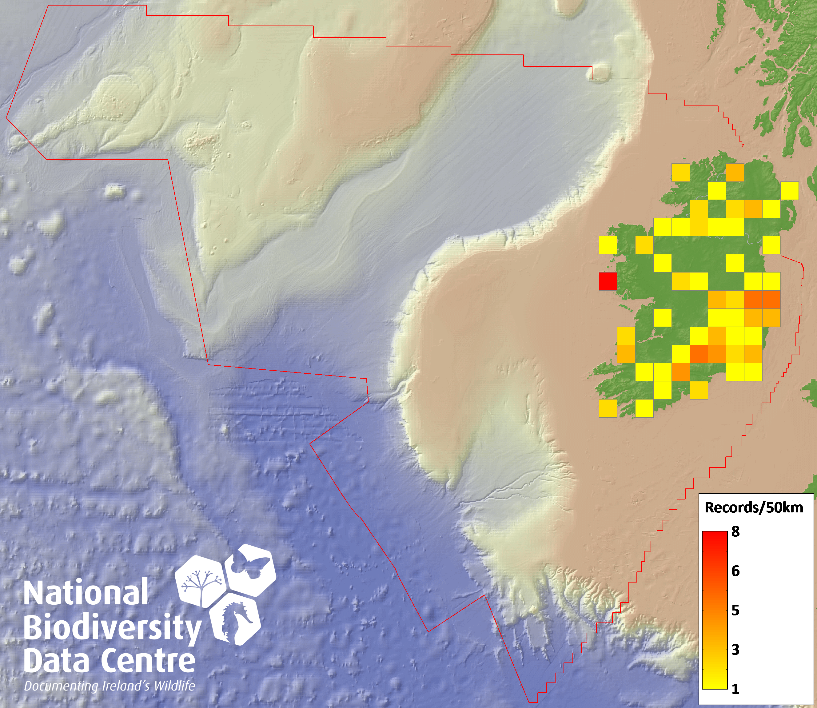 Distribution of the number of records recorded within each 10km grid square (ITM).Marine Map - 50km