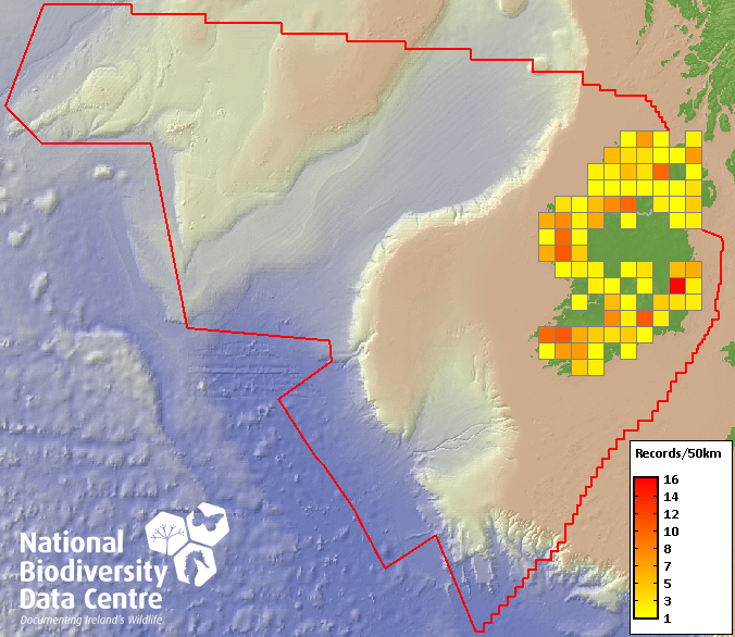 Distribution of the number of records recorded within each 10km grid square (ITM).Marine Map - 50km