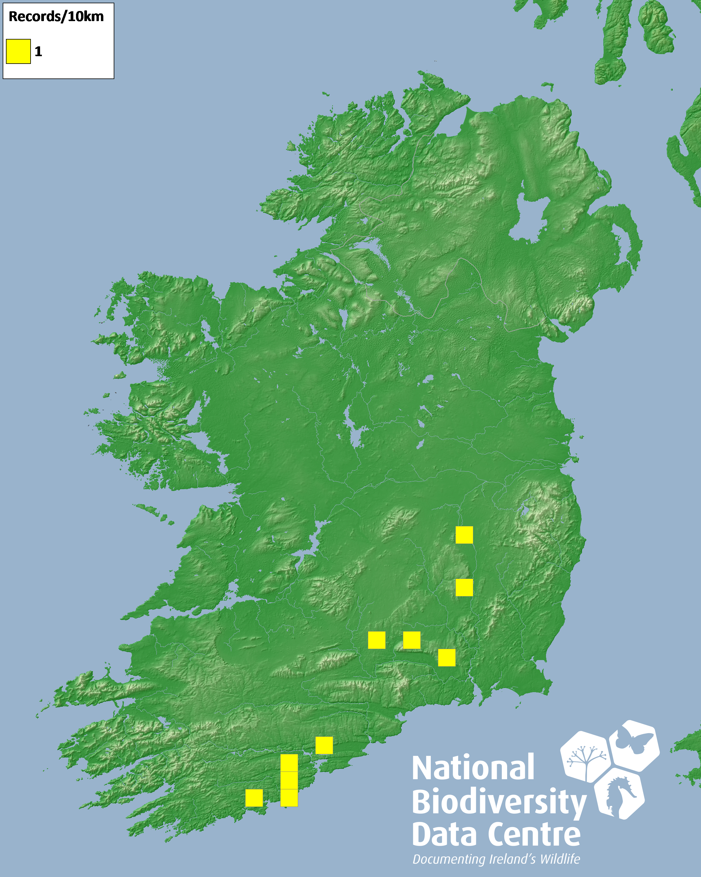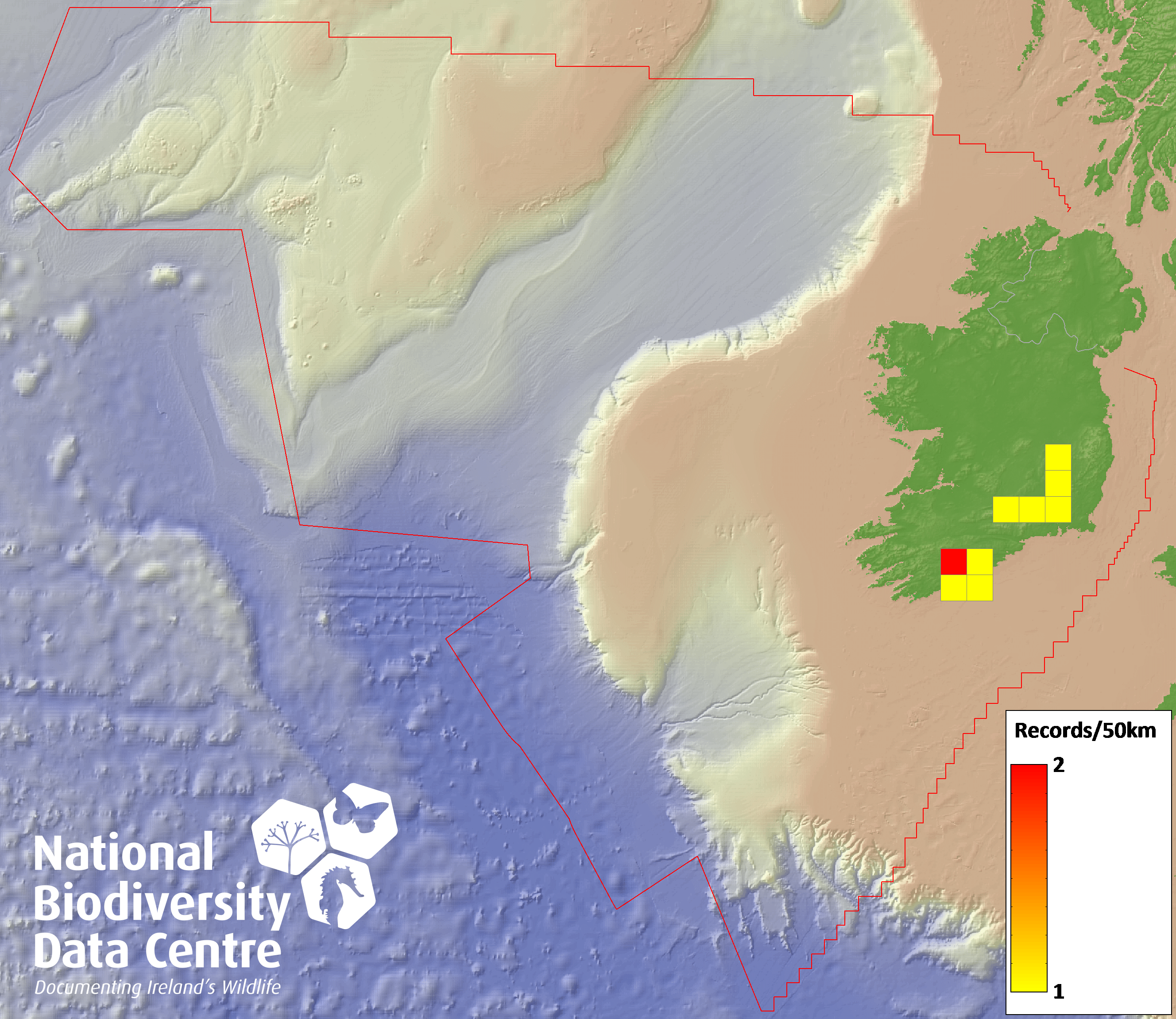 Distribution of the number of records recorded within each 10km grid square (ITM).Marine Map - 50km