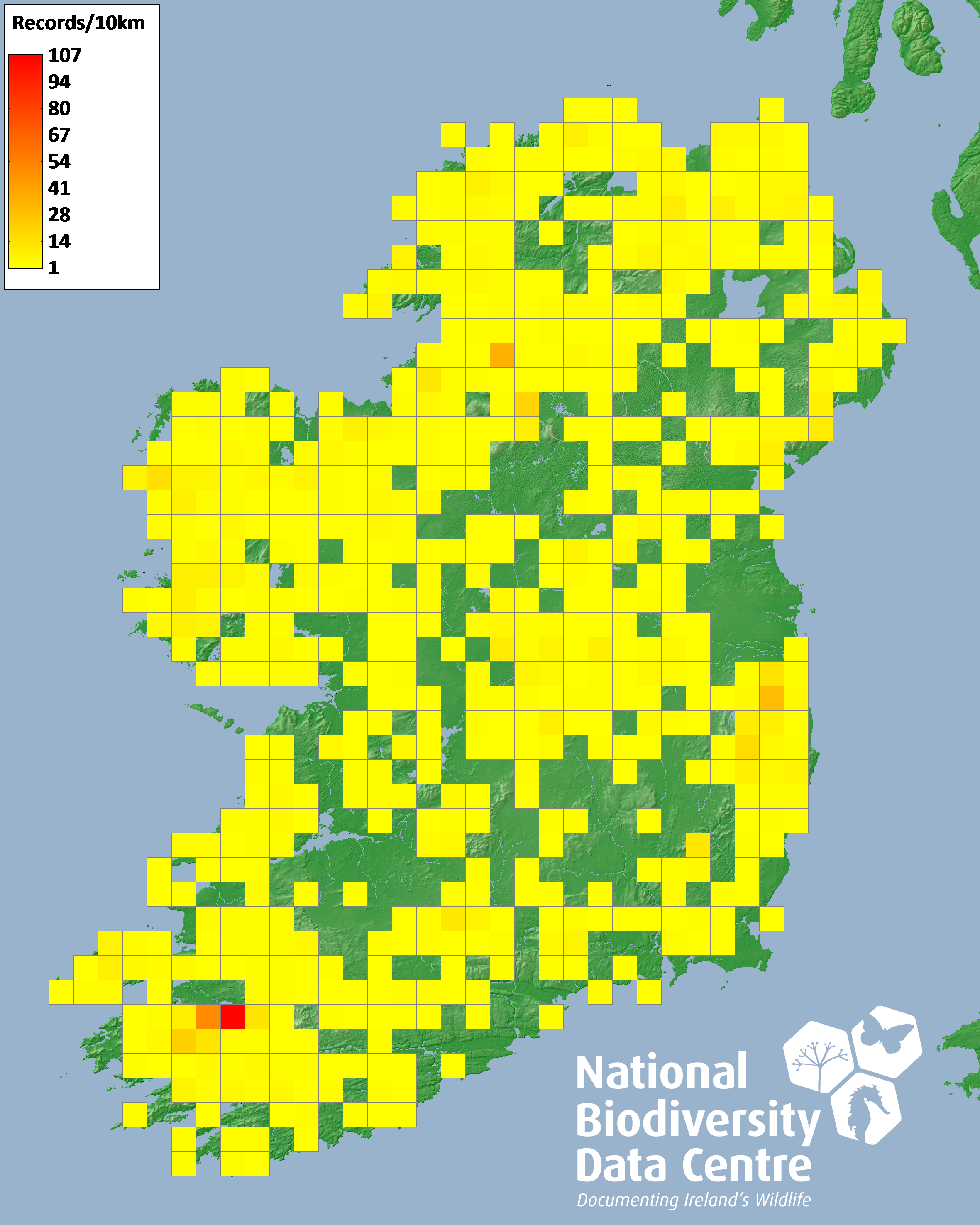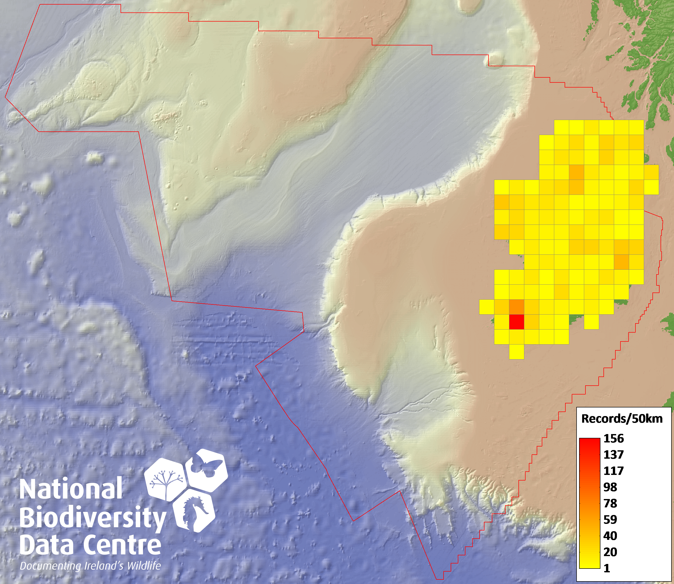 Distribution of the number of records recorded within each 10km grid square (ITM).Marine Map - 50km
