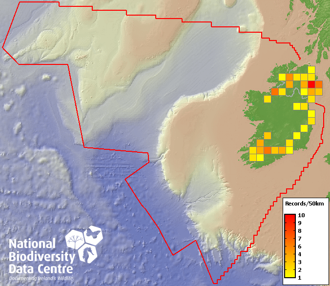 Distribution of the number of records recorded within each 10km grid square (ITM).Marine Map - 50km