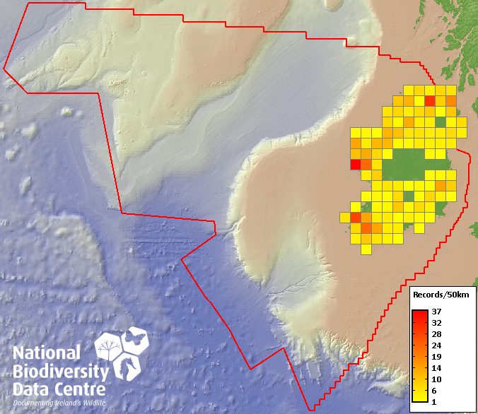 Distribution of the number of records recorded within each 10km grid square (ITM).Marine Map - 50km