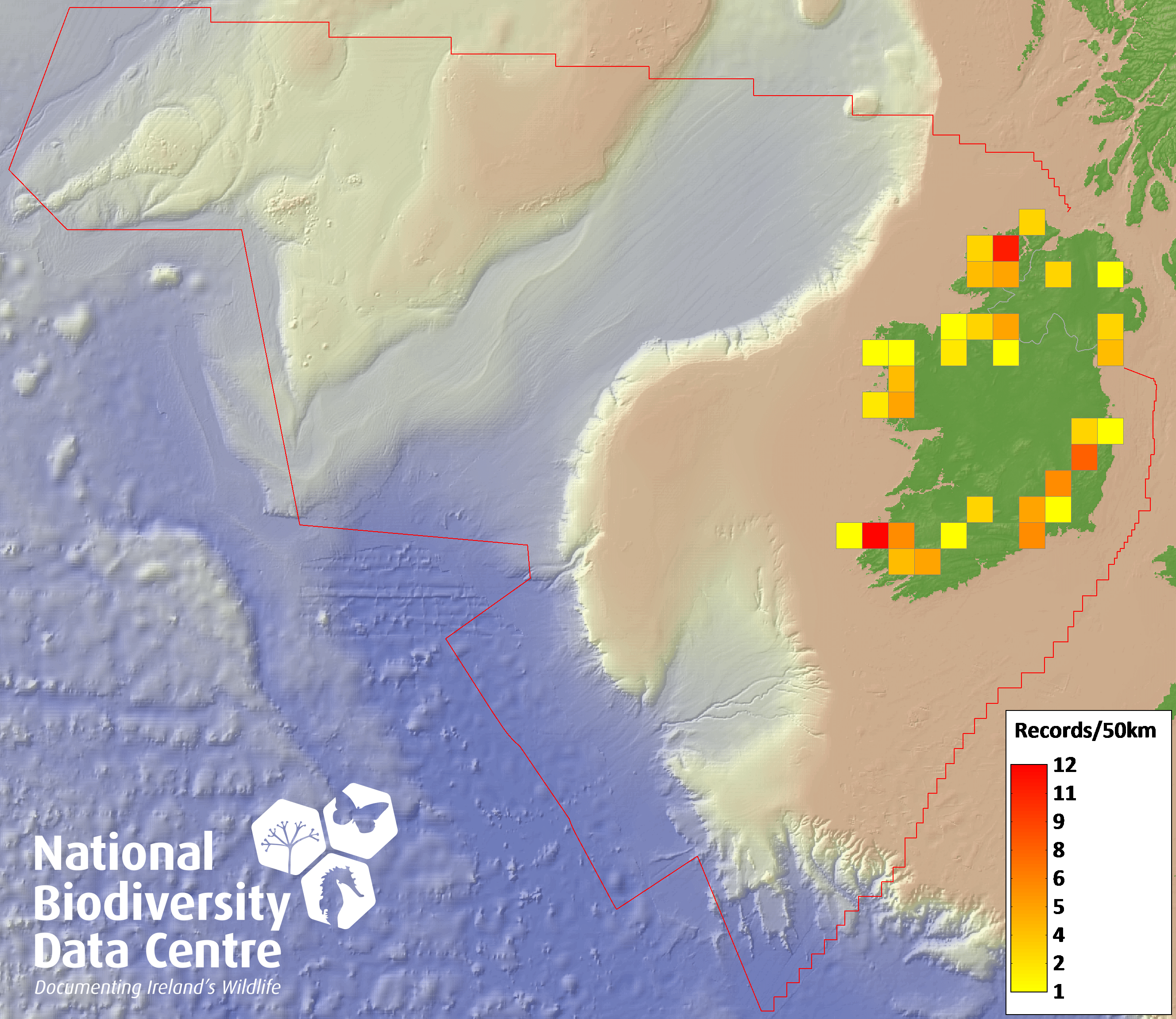 Distribution of the number of records recorded within each 10km grid square (ITM).Marine Map - 50km